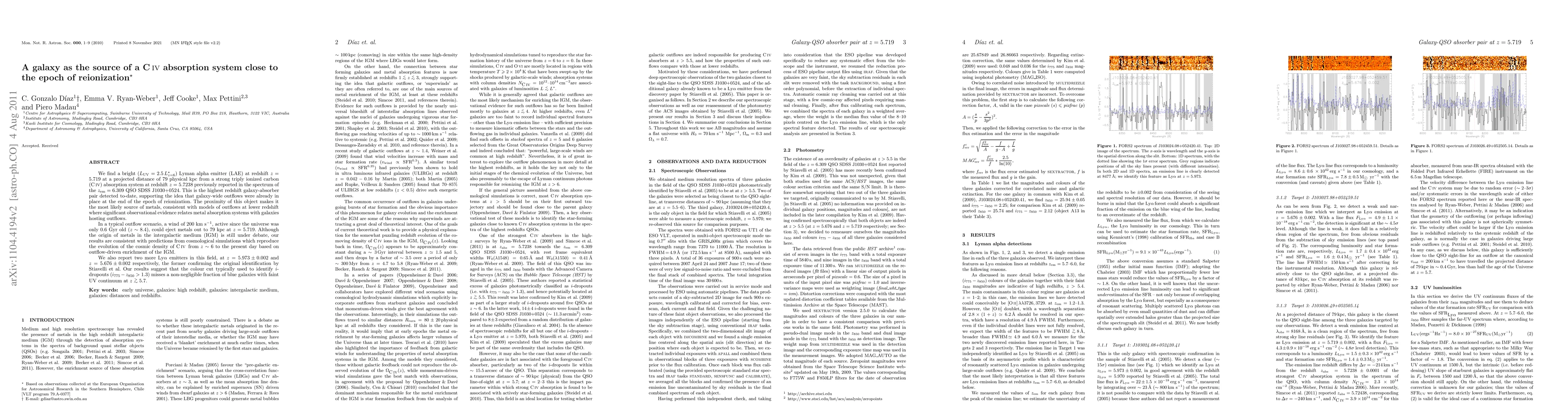 We find a bright (L_{UV}=2.5 L*_{z=6}) Lyman alpha emitter at redshift z=5.719 at a projected distance of 79 physical kpc from a strong triply ionized carbon (Civ) absorption system at redshift z=5.7238 previously reported in the spectrum of the z_{em} = 6.309 QSO SDSS J1030+0524. This is the highest redshift galaxy-absorber pair detected to-date, supporting the idea that galaxy-wide outflows were already in place at the end of the epoch of reionization. The proximity of this object makes it the most likely source of metals, consistent with models of outflows at lower redshift where significant observational evidence relates metal absorption systems with galaxies hosting outflows. In a typical outflow scenario, a wind of 200 km/s, active since the universe was only 0.6 Gyr old (z ~8.4), could eject metals out to 79 kpc at z=5.719. Although the origin of metals in the intergalactic medium (IGM) is still under debate, our results are consistent with predictions from cosmological simulations which reproduce the evolution of the cosmic density of Civ, from z ~ 6 to the present day based on outflow-driven enrichment of the IGM. We also report two more Lyman alpha emitters in this field, at z=5.973\pm 0.002 and z=5.676\pm 0.002 respectively, the former confirming the original identification by Stiavelli et al. Our results suggest that the colour cut typically used to identify i-dropouts (i_{775}-z_{850}>1.3) misses a non-negligible fraction of blue galaxies with faint UV continuum at z \geq 5.7.