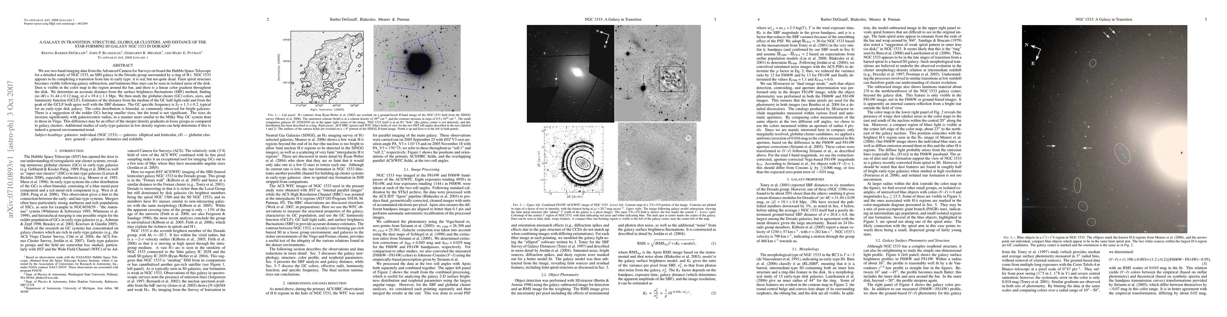 We use two-band imaging data from the Advanced Camera for Surveys on board the Hubble Space Telescope for a detailed study of NGC1533, an SB0 galaxy in the Dorado group surrounded by a ring of HI. NGC1533 appears to be completing a transition from late to early type: it is red, but not quite dead. Faint spiral structure becomes visible following galaxy subtraction, and luminous blue stars can be seen in isolated areas of the disk. Dust is visible in the color map in the region around the bar, and there is a linear color gradient throughout the disk. We determine an accurate distance from the surface brightness fluctuations (SBF) method, finding m-M = 31.44\pm0.12 mag, or d = 19.4\pm1.1 Mpc. We then study the globular cluster (GC) colors, sizes, and luminosity function (GCLF). Estimates of the distance from the median of the GC half-light radii and from the peak of the GCLF both agree well with the SBF distance. The GC specific frequency is S_N=1.3\pm0.2, typical for an early-type disk galaxy. The color distribution is bimodal, as commonly observed for bright galaxies. There is a suggestion of the redder GCs having smaller sizes, but the trend is not significant. The sizes do increase significantly with galactocentric radius, in a manner more similar to the Milky Way GC system than to those in Virgo. This difference may be an effect of the steeper density gradients in loose groups as compared to galaxy clusters. Additional studies of early-type galaxies in low density regions can help determine if this is indeed a general environmental trend.