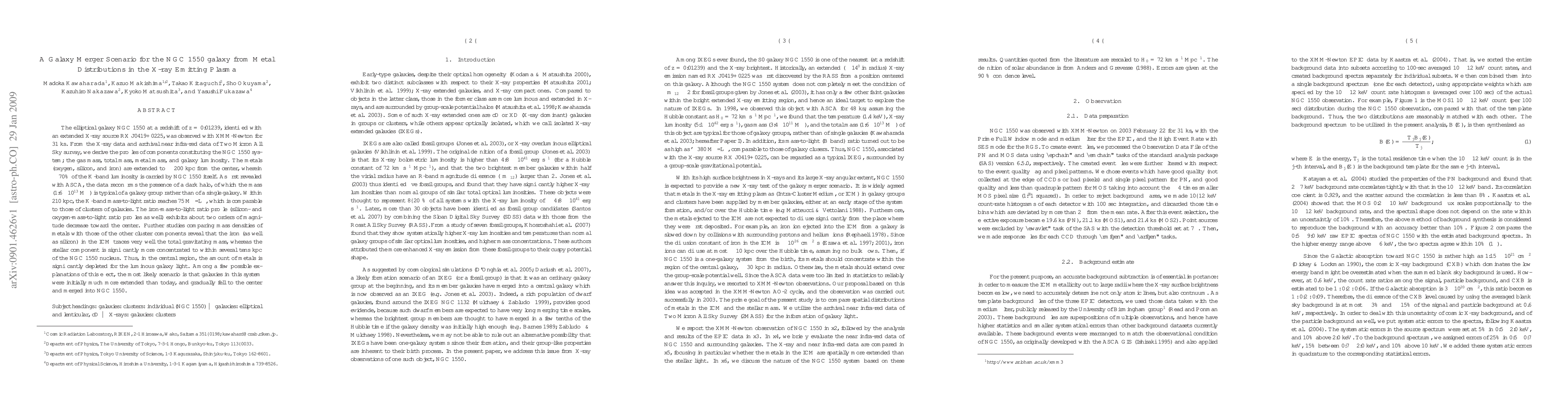 The elliptical galaxy NGC 1550 at a redshift of $z=0.01239$, identified with an extended X-ray source RX J0419+0225, was observed with {\it XMM-Newton} for 31 ks. From the X-ray data and archival near infra-red data of Two Micron All Sky survay, we derive the profiles of components constituting the NGC 1550 system; the gas mass, total mass, metal mass, and galaxy luminosity. The metals (oxygen, silicon, and iron) are extended to $\sim 200$ kpc from the center, wherein $\sim$ 70% of the $K$-band luminosity is carried by NGC 1550 itself. As first revealed with {\it ASCA}, the data reconfirms the presence of a dark halo, of which the mass ($1.6 \times 10^{13} M_{\odot}$) is typical of a galaxy group rather than of a single galaxy. Within 210 kpc, the $K$-band mass-to-light ratio reaches $75 M_{\odot}/L_{\odot}$, which is comparable to those of clusters of galaxies. The iron-mass-to-light ratio profile (silicon- and oxygen mass-to-light ratio profiles as well) exhibits about two orders of magnitude decrease toward the center. Further studies comparing mass densities of metals with those of the other cluster components reveal that the iron (as well as silicon) in the ICM traces very well the total gravitating mass, whereas the stellar component is significantly more concentrated to within several tens kpc of the NGC 1550 nucleus. Thus, in the central region, the amount of metals is significantly depleted for the luminous galaxy light. Among a few possible explanations of this effect, the most likely scenario is that galaxies in this system were initially much more extended than today, and gradually fell to the center and merged into NGC 1550.