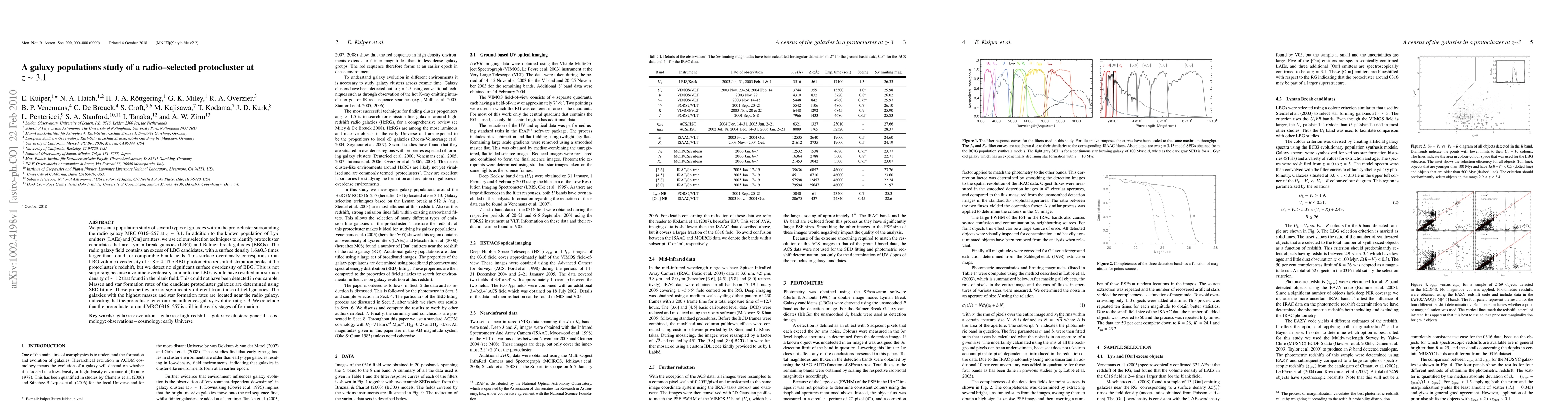 We present a population study of several types of galaxies within the protocluster surrounding the radio galaxy MRC0316-257 at z~3.1. In addition to the known population of Ly_alpha emitters (LAEs) and [OIII] emitters, we use colour selection techniques to identify protocluster candidates that are Lyman break galaxies (LBG) and Balmer break galaxies (BBGs). The radio galaxy field contains an excess of LBG candidates, with a surface density 1.6\pm0.3 times larger than found for comparable blank fields. This surface overdensity corresponds to an LBG volume overdensity of ~8\pm4. The BBG photometric redshift distribution peaks at the protocluster's redshift, but we detect no significant surface overdensity of BBG. This is not surprising because a volume overdensity similar to the LBGs would have resulted in a surface density of ~1.2 that found in the blank field. This could not have been detected in our sample. Masses and star formation rates of the candidate protocluster galaxies are determined using SED fitting. These properties are not significantly different from those of field galaxies. The galaxies with the highest masses and star formation rates are located near the radio galaxy, indicating that the protocluster environment influences galaxy evolution at z~3. We conclude that the protocluster around MRC0316-257 is still in the early stages of formation.