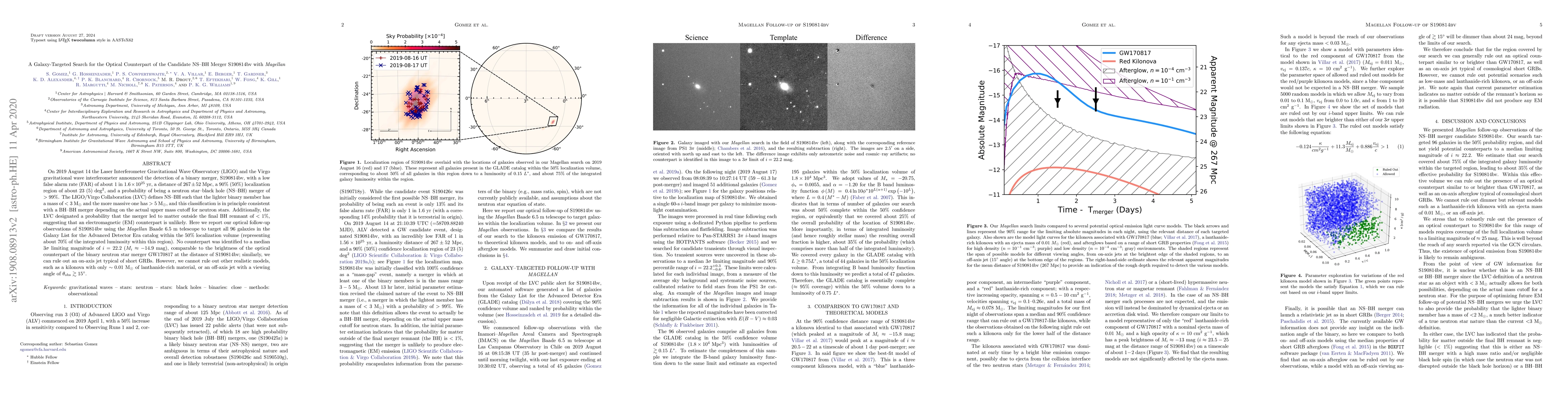 On 2019 August 14 the Laser Interferometer Gravitational Wave Observatory (LIGO) and the Virgo gravitational wave interferometer announced the detection of a binary merger, S190814bv, with a low false alarm rate (FAR) of about 1 in $1.6\times 10^{25}$ years, a distance of $267\pm 52$ Mpc, a 90\% (50\%) localization region of about 23 (5) deg$^2$, and a probability of being a neutron star--black hole (NS-BH) merger of $>99\%$. The LIGO/Virgo Collaboration (LVC) defines NS-BH such that the lighter binary member has a mass of $<3$ M$_\odot$ and the more massive one has $>5$ M$_\odot$, and this classification is in principle consistent with a BH-BH merger depending on the actual upper mass cut-off for neutron stars. Additionally, the LVC designated a probability that the merger led to matter outside the final BH remnant of $<1\%$, suggesting that an electromagnetic (EM) counterpart is unlikely. Here we report our optical follow-up observations of S190814bv using the Magellan Baade 6.5 m telescope to target all 96 galaxies in the GLADE catalog within the 50\% localization volume (representing about 70\% of the integrated luminosity within this region). No counterpart was identified to a median $3\sigma$ limiting magnitude of $i=22.2$ ($M_i\approx -14.9$ mag), comparable to the brightness of the optical counterpart of the binary neutron star merger GW170817 at the distance of S190814bv; similarly, we can rule out an on-axis jet typical of short GRBs. However, we cannot rule out other realistic models, such as a kilonova with only $\sim 0.01$ M$_\odot$ of lanthanide-rich material, or an off-axis jet with a viewing angle of $\theta_{\rm obs}\gtrsim 15^\circ$.
