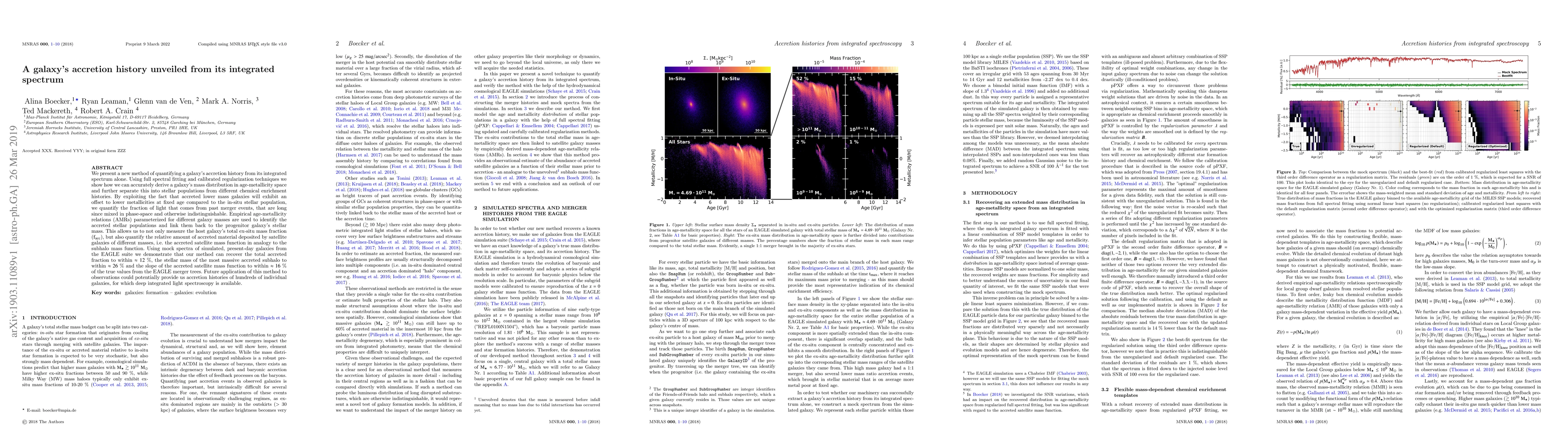 We present a new method of quantifying a galaxy's accretion history from its integrated spectrum alone. Using full spectral fitting and calibrated regularization techniques we show how we can accurately derive a galaxy's mass distribution in age-metallicity space and further separate this into stellar populations from different chemical enrichment histories. By exploiting the fact that accreted lower mass galaxies will exhibit an offset to lower metallicities at fixed age compared to the in-situ stellar population, we quantify the fraction of light that comes from past merger events, that are long since mixed in phase-space and otherwise indistinguishable. Empirical age-metallicity relations (AMRs) parameterized for different galaxy masses are used to identify the accreted stellar populations and link them back to the progenitor galaxy's stellar mass. This allows us to not only measure the host galaxy's total ex-situ mass fraction ($f_{acc}$), but also quantify the relative amount of accreted material deposited by satellite galaxies of different masses, i.e. the accreted satellite mass function in analogy to the subhalo mass function. Using mock spectra of simulated, present-day galaxies from the EAGLE suite we demonstrate that our method can recover the total accreted fraction to within $\approx 12 \%$, the stellar mass of the most massive accreted subhalo to within $\approx 26 \%$ and the slope of the accreted satellite mass function to within $\approx 16 \%$ of the true values from the EAGLE merger trees. Future application of this method to observations could potentially provide us accretion histories of hundreds of individual galaxies, for which deep integrated light spectroscopy is available.