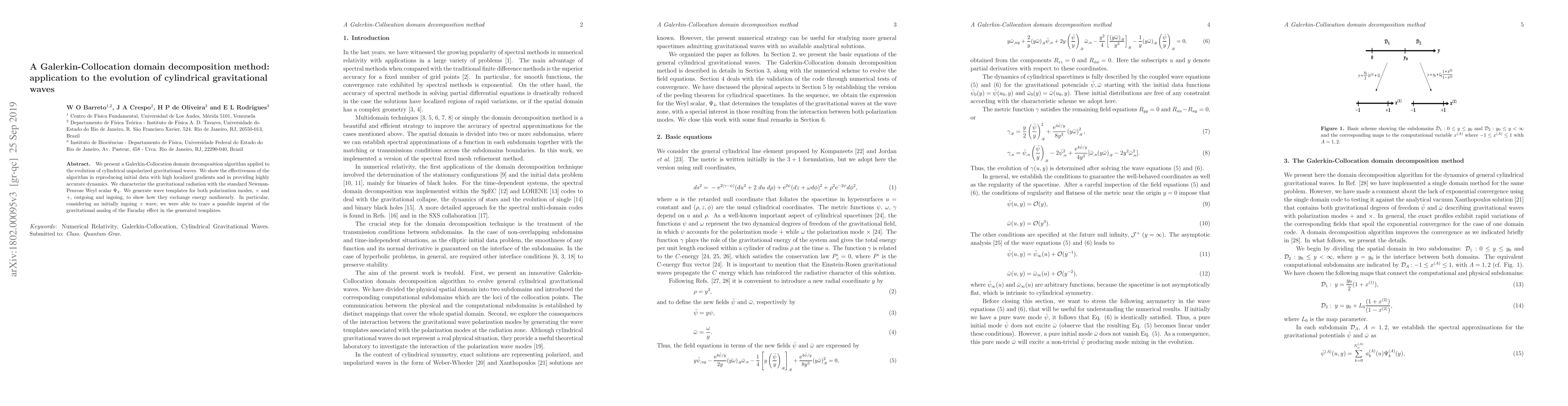 We present a Galerkin-Collocation domain decomposition algorithm applied to the evolution of cylindrical unpolarized gravitational waves. We show the effectiveness of the algorithm in reproducing initial data with high localized gradients and in providing highly accurate dynamics. We characterize the gravitational radiation with the standard Newman-Penrose Weyl scalar $\Psi_4$. We generate wave templates for both polarization modes, $\times$ and $+$, outgoing and ingoing, to show how they exchange energy nonlinearly. In particular, considering an initially ingoing $\times$ wave, we were able to trace a possible imprint of the gravitational analog of the Faraday effect in the generated templates.