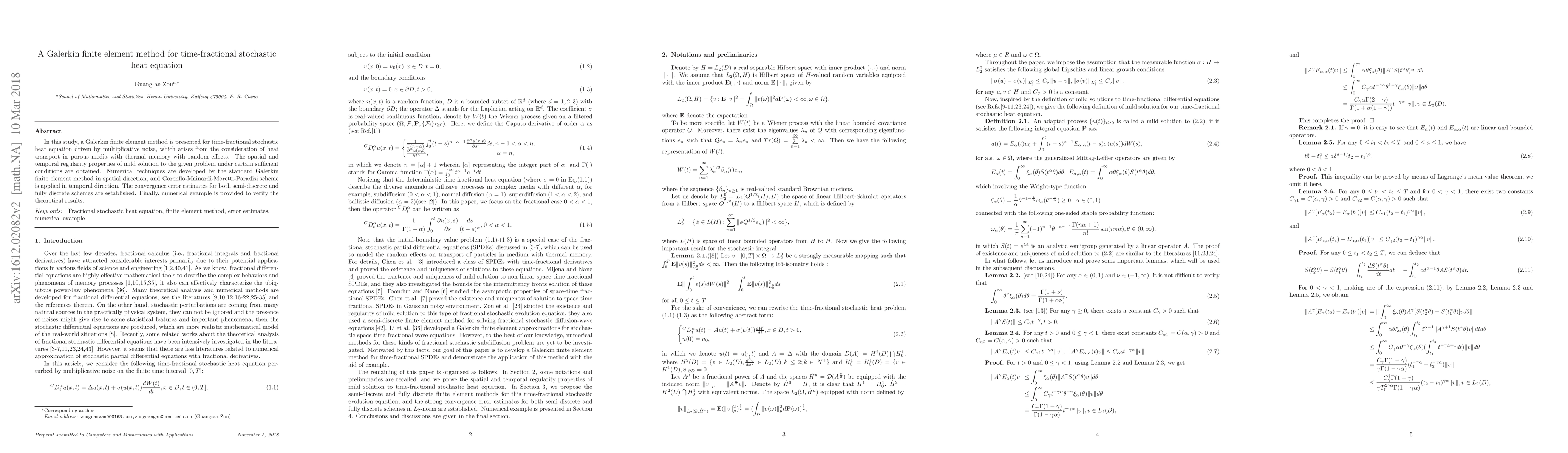 In this study, a Galerkin finite element method is presented for time-fractional stochastic heat equation driven by multiplicative noise, which arises from the consideration of heat transport in porous media with thermal memory with random effects. The spatial and temporal regularity properties of mild solution to the given problem under certain sufficient conditions are obtained. Numerical techniques are developed by the standard Galerkin finite element method in spatial direction, and Gorenflo-Mainardi-Moretti-Paradisi scheme is applied in temporal direction. The convergence error estimates for both semi-discrete and fully discrete schemes are established. Finally, numerical example is provided to verify the theoretical results.