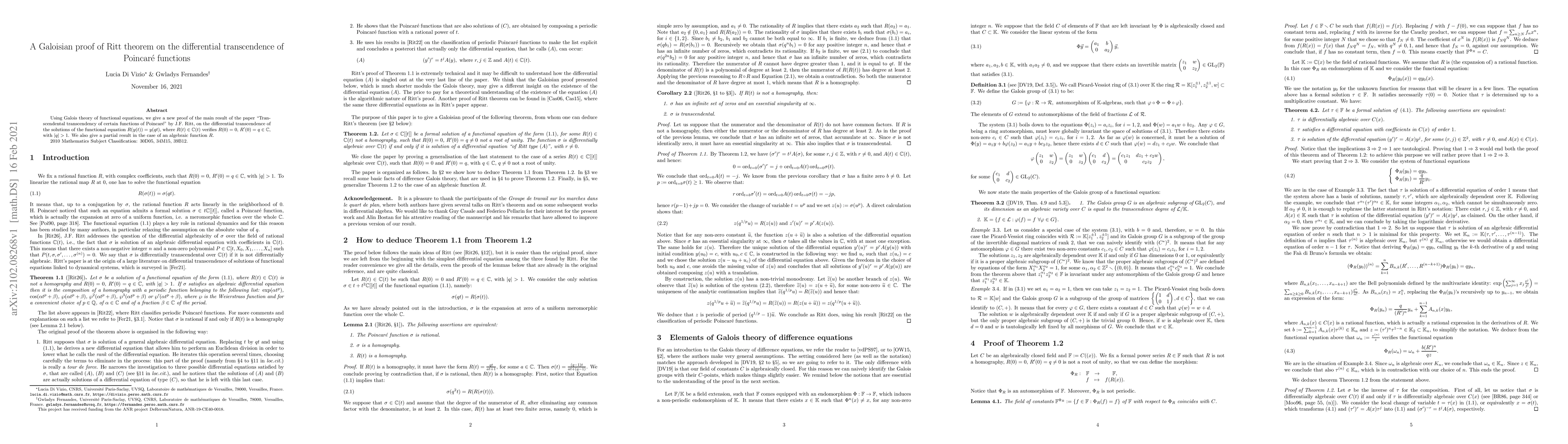 This paper presents a new Galoisian proof of Ritt's theorem on the differential transcendence of Poincaré functions, using Galois theory of functional equations. It confirms the transcendence of solutions to the functional equation R(y(t))=y(qt) for rational functions R, and provides a partial result for algebraic functions R.