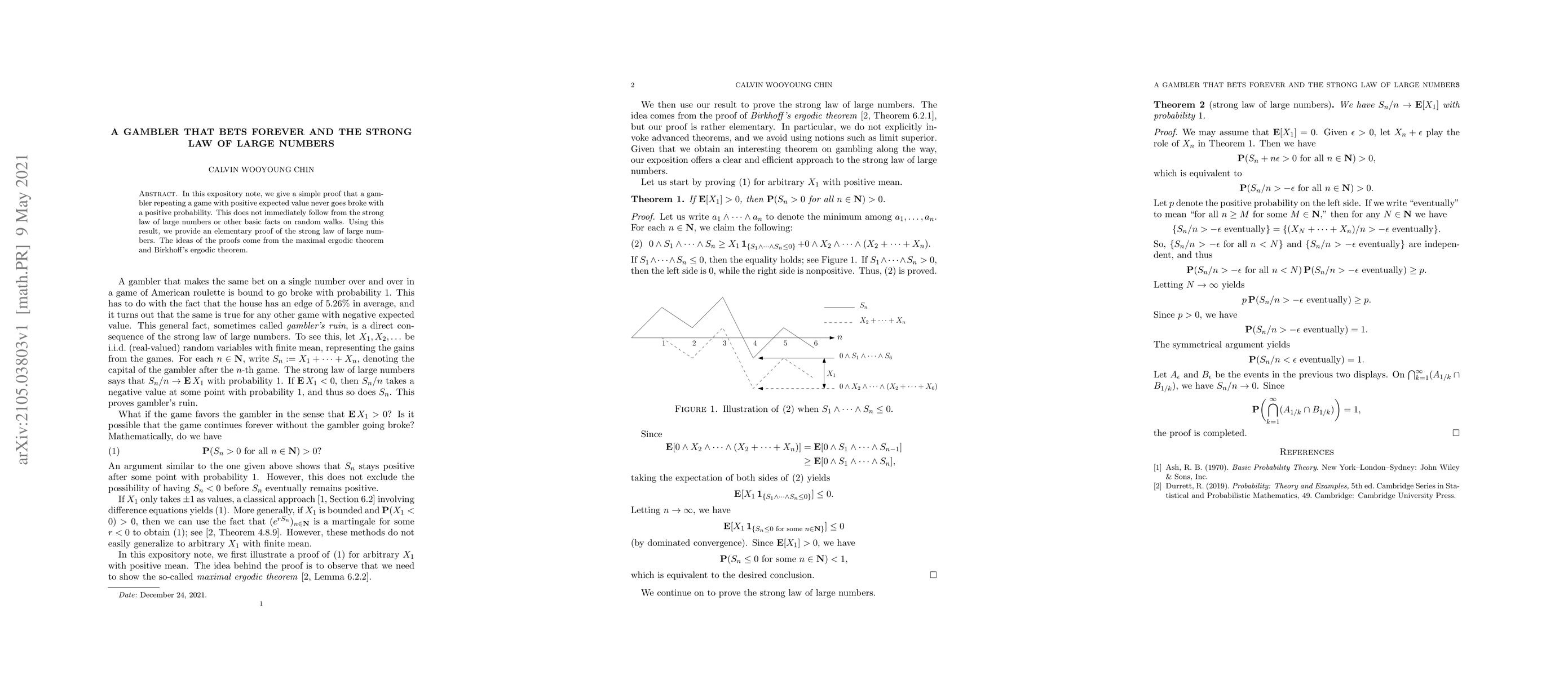 This paper presents a simple proof that a gambler playing a game with a positive expected value will not go broke with positive probability, using insights from the maximal ergodic theorem and Birkhoff's ergodic theorem. It also provides an elementary proof of the strong law of large numbers based on this result.