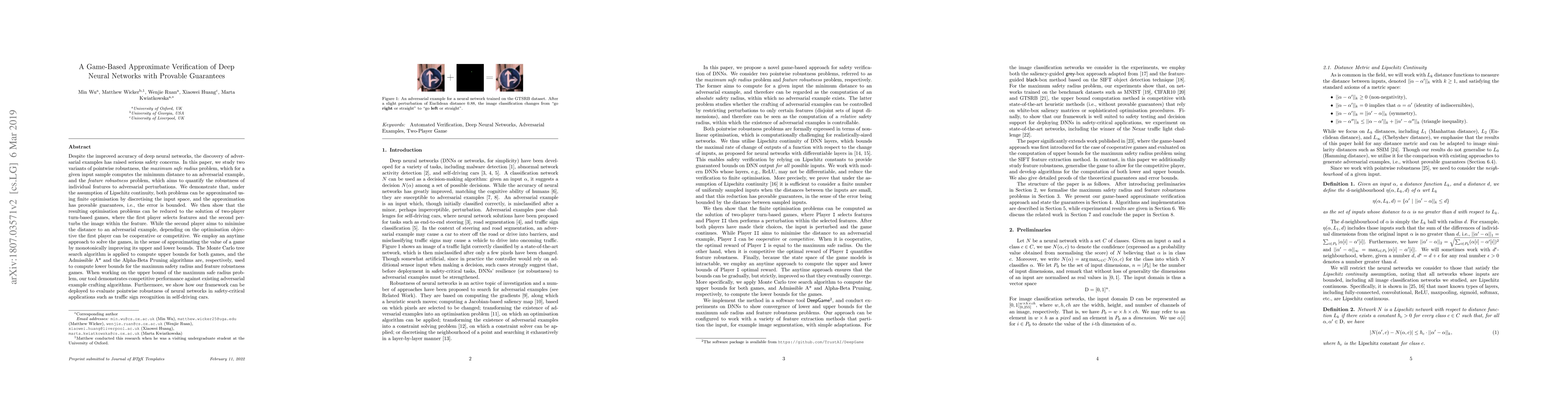 This paper proposes a game-based method for approximating the robustness of deep neural networks, focusing on the maximum safe radius and feature robustness problems. It uses finite optimization and discretisation to provide provable guarantees on the approximation error, framing the robustness evaluation as a two-player game. The method employs Monte Carlo tree search and admissible algorithms for efficient computation and demonstrates competitive performance in evaluating neural network robustness for safety-critical applications like traffic sign recognition.