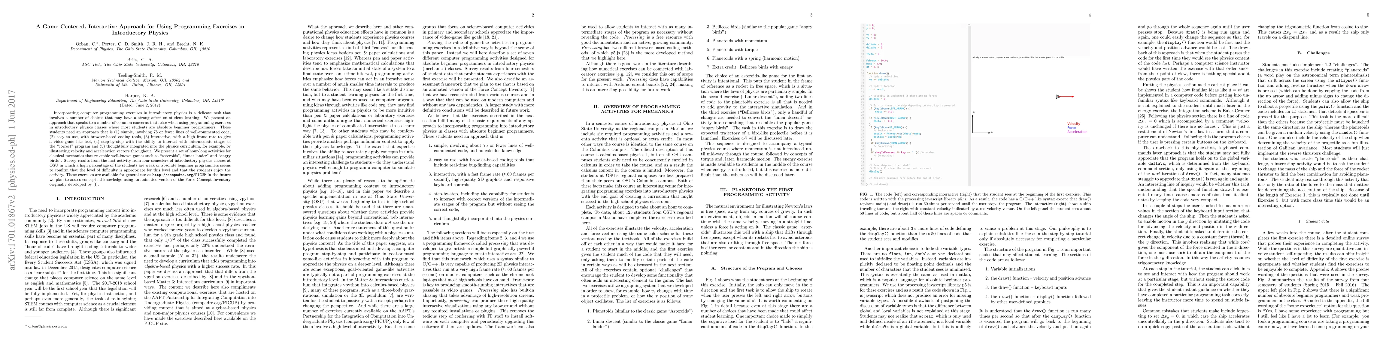 This paper proposes a game-centered, interactive programming approach for introductory physics, designed for beginner programmers. It emphasizes simplicity, ease of use, interactivity, and integration into the physics curriculum, illustrated through game-like activities resembling "asteroids" and "angry birds." Initial survey results from OSU show that students enjoy the activities and find them appropriately challenging.