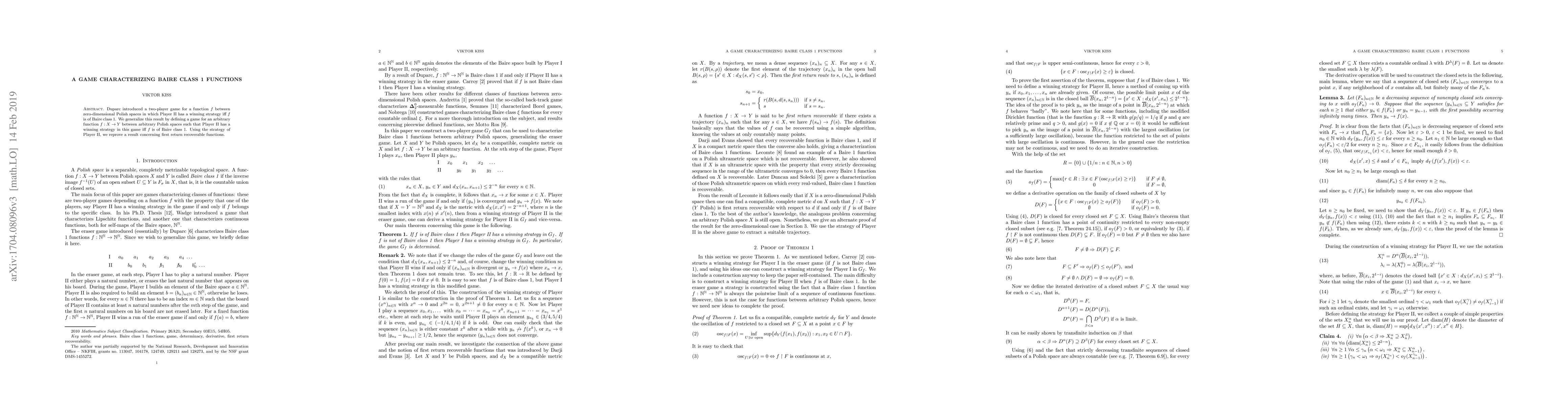 This paper generalizes a game introduced by Duparc to characterize Baire class 1 functions, showing that Player II wins if and only if the function is of Baire class 1, and uses the winning strategy to reprove results on first return recoverable functions.