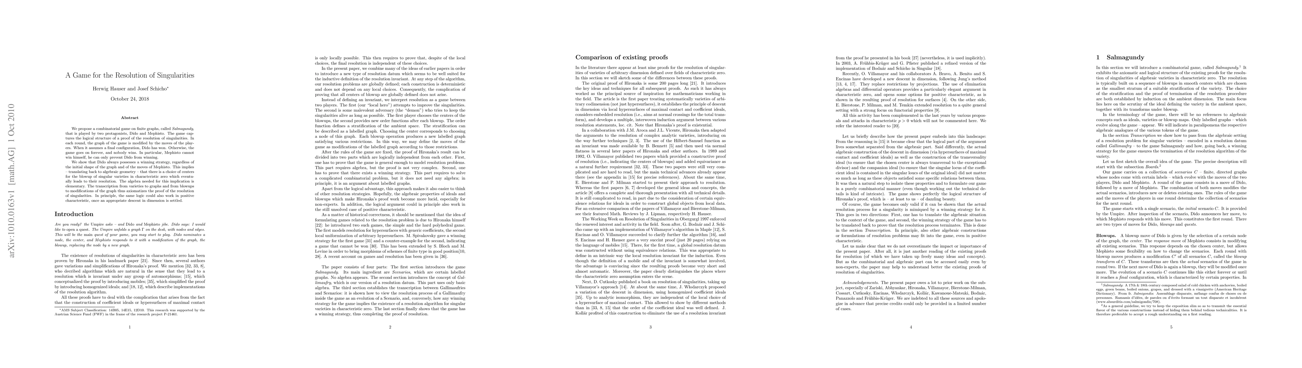 We propose a combinatorial game on finite graphs, called Salmagundy, that is played by two protagonists, Dido and Mephisto. The game captures the logical structure of a proof of the resolution of singularities. In each round, the graph of the game is modified by the moves of the players. When it assumes a final configuration, Dido has won. Otherwise, the game goes on forever, and nobody wins. In particular, Mephisto cannot win himself, he can only prevent Dido from winning. We show that Dido always possesses a winning strategy, regardless of the initial shape of the graph and of the moves of Mephisto. This implies -- translating back to algebraic geometry -- that there is a choice of centers for the blowup of singular varieties in characteristic zero which eventually leads to their resolution. The algebra needed for this implication is elementary. The transcription from varieties to graphs and from blowups to modifications of the graph thus axiomatizes the proof of the resolution of singularities. In principle, the same logic could also work in positive characteristic, once an appropriate descent in dimension is settled.