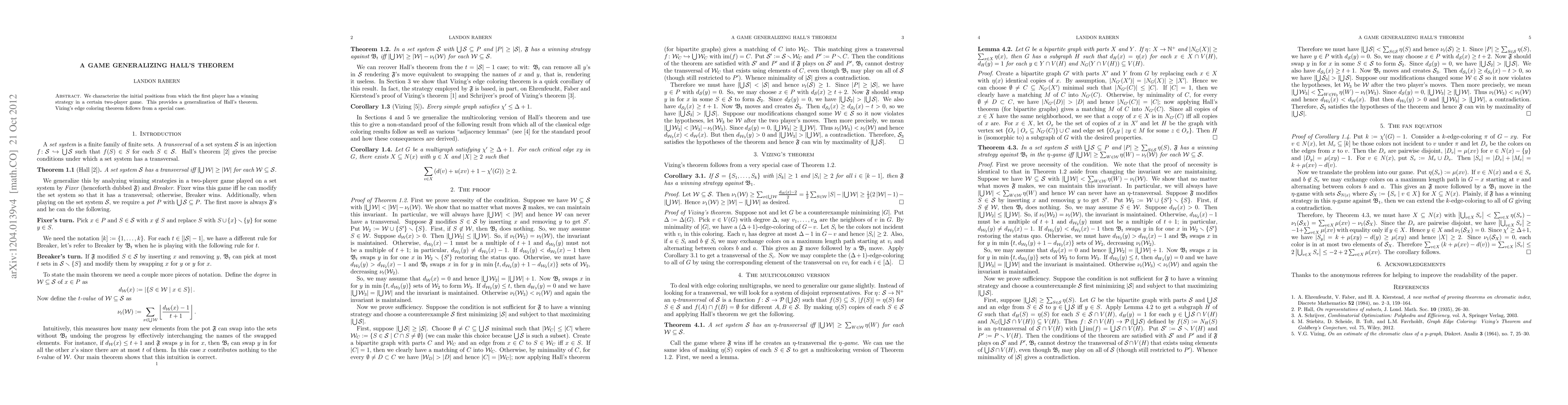 Summary: This paper characterizes winning strategies for the first player in a generalized two-player game, extending Hall's theorem, and demonstrates that Vizing's edge coloring theorem emerges as a special case.