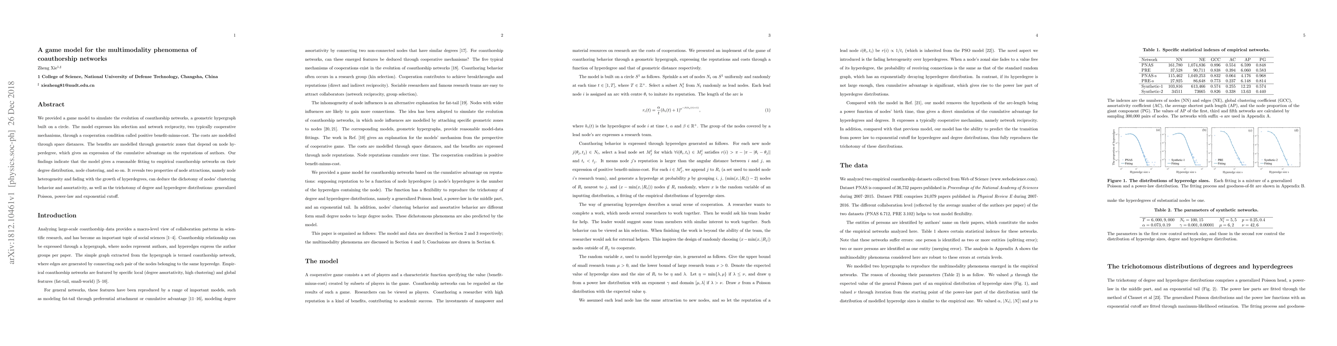 This paper introduces a game model to simulate the evolution of coauthorship networks, highlighting kin selection and network reciprocity through a cooperation condition. The model's findings show a good fit to empirical data in terms of degree distribution and node clustering, revealing properties like node heterogeneity and the dichotomy of clustering behavior.