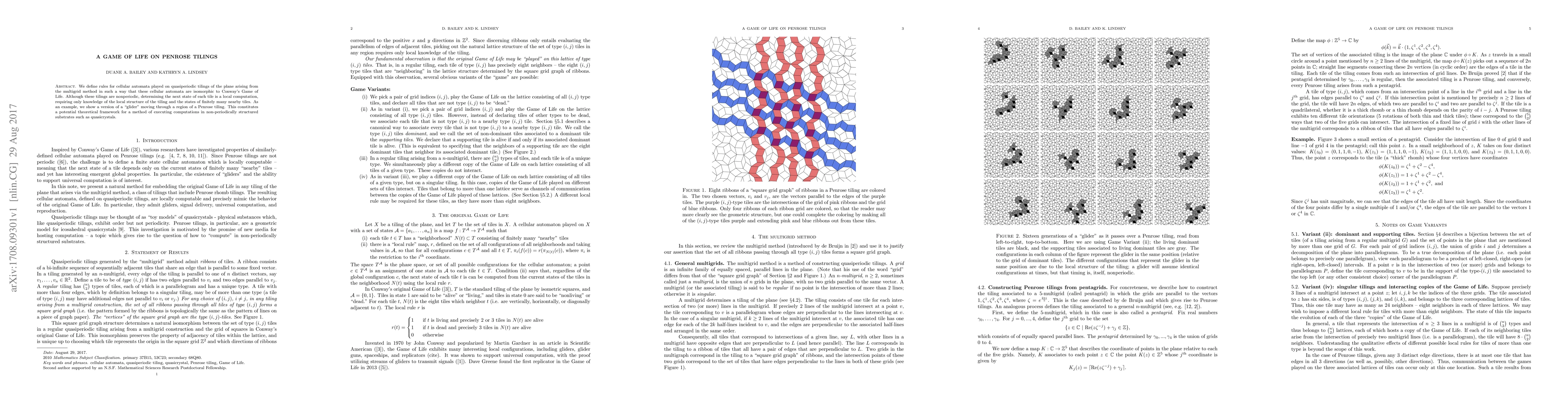We define rules for cellular automata played on quasiperiodic tilings of the plane arising from the multigrid method in such a way that these cellular automata are isomorphic to Conway's Game of Life. Although these tilings are nonperiodic, determining the next state of each tile is a local computation, requiring only knowledge of the local structure of the tiling and the states of finitely many nearby tiles. As an example, we show a version of a "glider" moving through a region of a Penrose tiling. This constitutes a potential theoretical framework for a method of executing computations in non-periodically structured substrates such as quasicrystals.