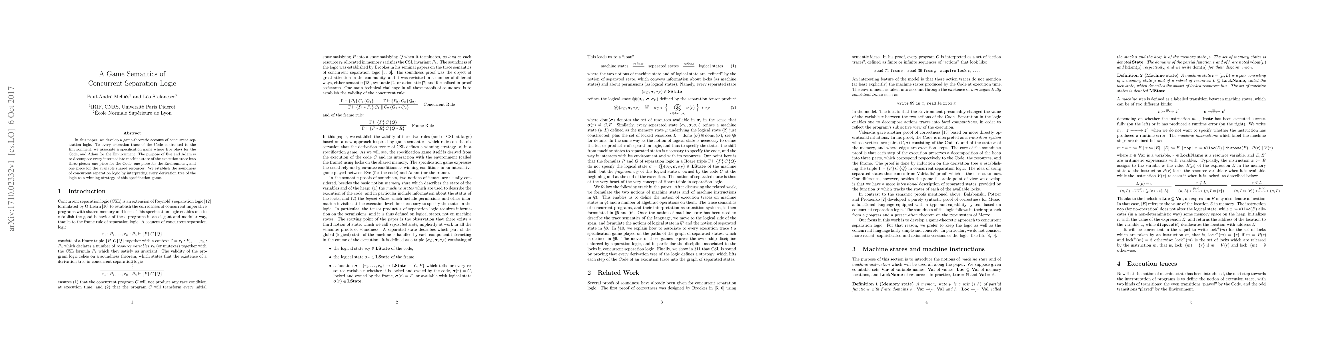 This paper presents a game-theoretic framework for concurrent separation logic, where Eve and Adam play a specification game to decompose execution states into Code, Environment, and shared resources. It proves the logic's soundness by linking derivation trees to winning strategies in the game.