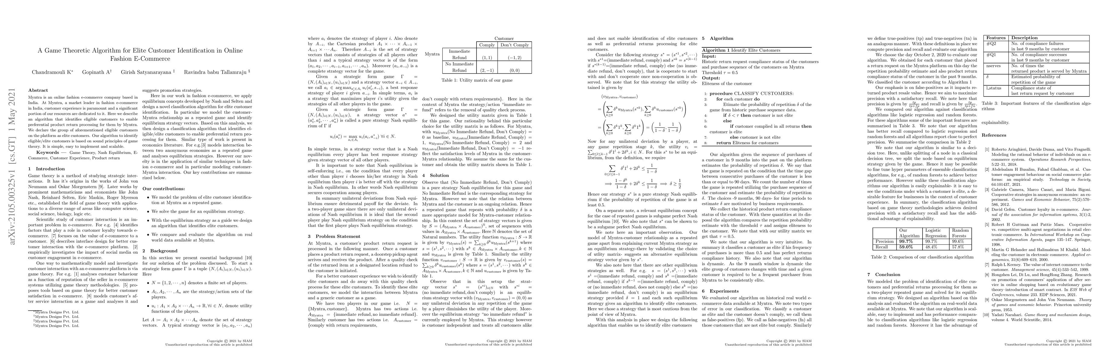 Myntra is an online fashion e-commerce company based in India. At Myntra, a market leader in fashion e-commerce in India, customer experience is paramount and a significant portion of our resources are dedicated to it. Here we describe an algorithm that identifies eligible customers to enable preferential product return processing for them by Myntra. We declare the group of aforementioned eligible customers on the platform as elite customers. Our algorithm to identify eligible/elite customers is based on sound principles of game theory. It is simple, easy to implement and scalable.