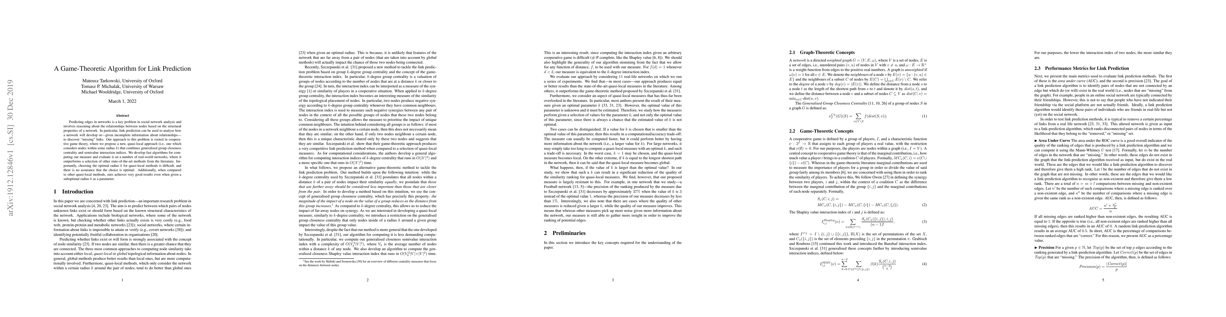 This research paper proposes a game-theoretic algorithm for link prediction in networks, outperforming state-of-the-art methods with a quasi-local approach that considers nodes within a radius k.