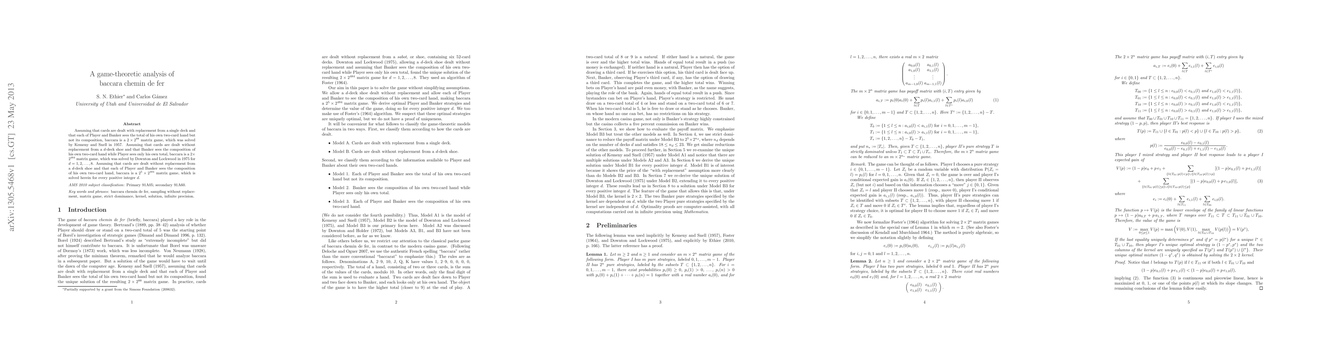 Assuming that cards are dealt with replacement from a single deck and that each of Player and Banker sees the total of his own two-card hand but not its composition, baccara is a 2 x 2^88 matrix game, which was solved by Kemeny and Snell in 1957. Assuming that cards are dealt without replacement from a d-deck shoe and that Banker sees the composition of his own two-card hand while Player sees only his own total, baccara is a 2 x 2^484 matrix game, which was solved by Downton and Lockwood in 1975 for d=1,2,...,8. Assuming that cards are dealt without replacement from a d-deck shoe and that each of Player and Banker sees the composition of his own two-card hand, baccara is a 2^5 x 2^484 matrix game, which is solved herein for every positive integer d.