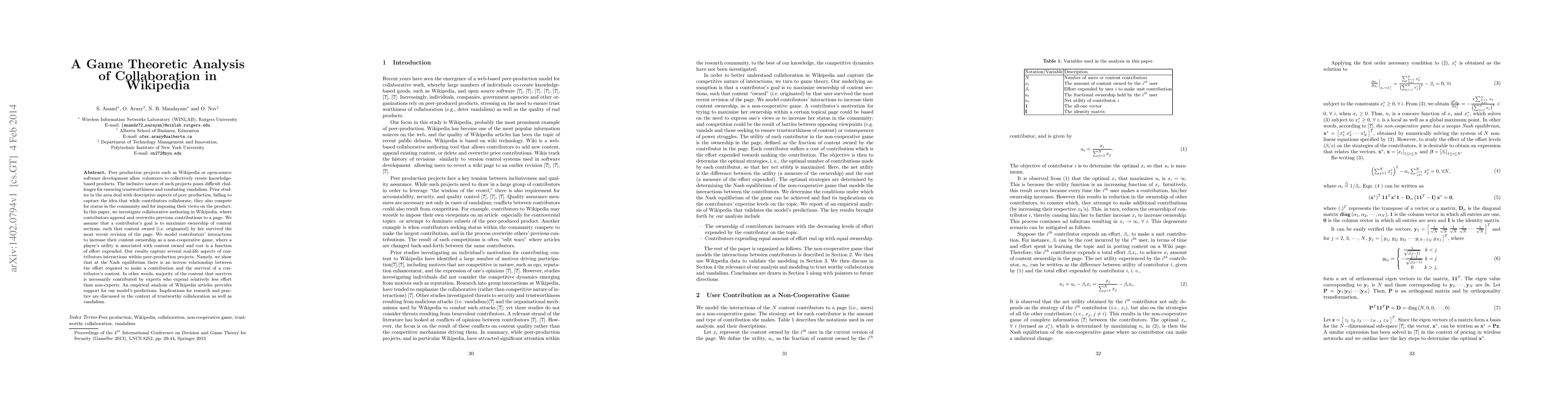 Peer production projects such as Wikipedia or open-source software development allow volunteers to collectively create knowledge based products. The inclusive nature of such projects poses difficult challenges for ensuring trustworthiness and combating vandalism. Prior studies in the area deal with descriptive aspects of peer production, failing to capture the idea that while contributors collaborate, they also compete for status in the community and for imposing their views on the product. In this paper we investigate collaborative authoring in Wikipedia where contributors append and overwrite previous contributions to a page. We assume that a contributors goal is to maximize ownership of content sections such that content owned (or originated) by her survived the most recent revision of the page. We model contributors interactions to increase their content ownership as a noncooperative game where a players utility is associated with content owned and cost is a function of effort expended. Our results capture several real life aspects of contributors interactions within peer production projects. We show that at the Nash equilibrium there is an inverse relationship between the effort required to make a contribution and the survival of a contributors content. In other words majority of the content that survives is necessarily contributed by experts who expend relatively less effort than non experts. An empirical analysis of Wikipedia articles provides support for our models predictions. Implications for research and practice are discussed in the context of trustworthy collaboration as well as vandalism.