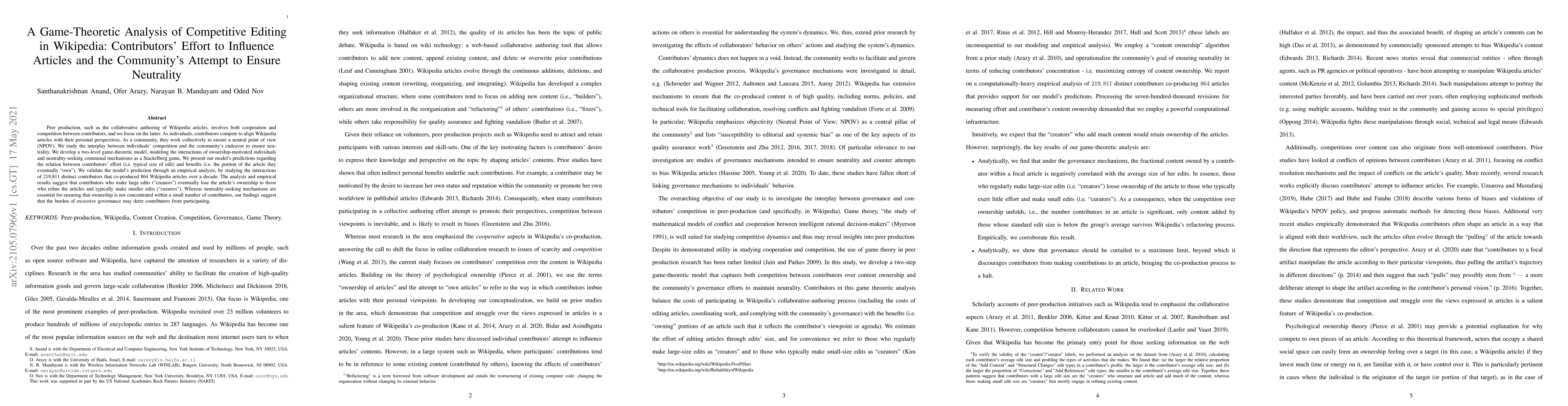 This paper uses a game-theoretic model to analyze the competitive dynamics between Wikipedia contributors who aim to shape articles according to their perspectives while the community strives to maintain neutrality. The study finds that contributors who make larger edits often lose ownership to those who make smaller, refining edits, highlighting the tension between individual influence and communal neutrality.