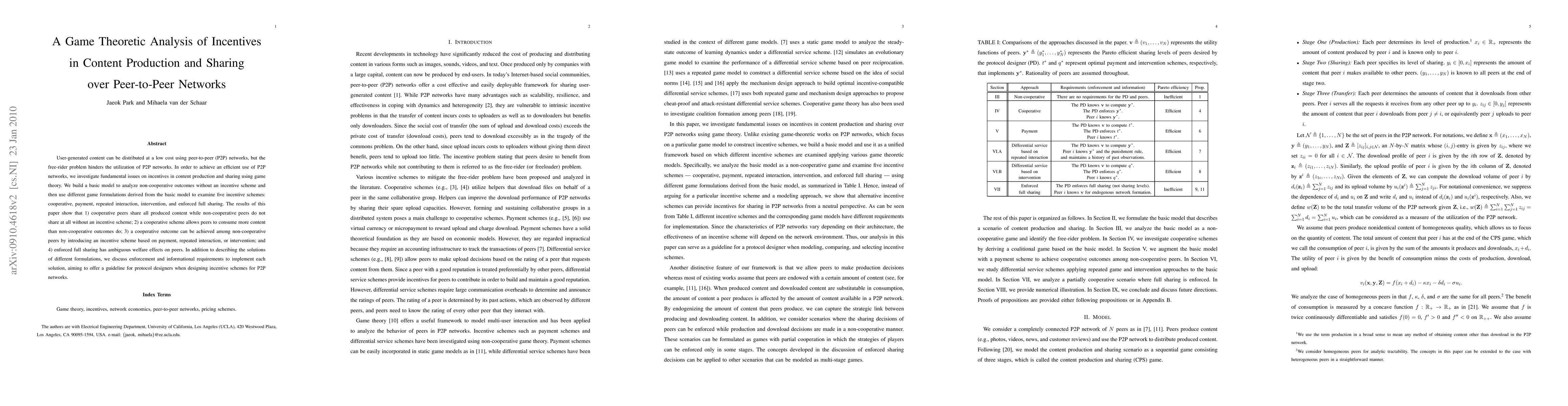 This paper uses game theory to analyze incentives for content production and sharing in peer-to-peer networks, identifying that cooperative schemes enhance content consumption while various incentive mechanisms can shift outcomes from non-cooperative to cooperative sharing. The study also highlights the ambiguous welfare effects of enforced full sharing and discusses practical implementation challenges.