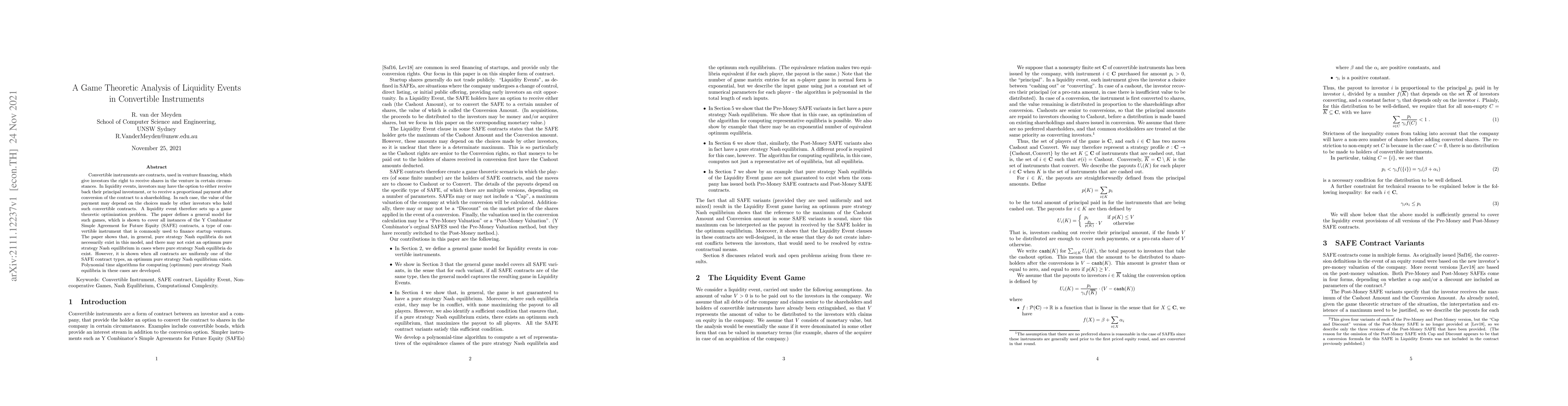 Convertible instruments are contracts, used in venture financing, which give investors the right to receive shares in the venture in certain circumstances. In liquidity events, investors may have the option to either receive back their principal investment, or to receive a proportional payment after conversion of the contract to a shareholding. In each case, the value of the payment may depend on the choices made by other investors who hold such convertible contracts. A liquidity event therefore sets up a game theoretic optimization problem. The paper defines a general model for such games, which is shown to cover all instances of the Y Combinator Simple Agreement for Future Equity (SAFE) contracts, a type of convertible instrument that is commonly used to finance startup ventures. The paper shows that, in general, pure strategy Nash equilibria do not necessarily exist in this model, and there may not exist an optimum pure strategy Nash equilibrium in cases where pure strategy Nash equilibria do exist. However, it is shown when all contracts are uniformly one of the SAFE contract types, an optimum pure strategy Nash equilibrium exists. Polynomial time algorithms for computing (optimum) pure strategy Nash equilibria in these cases are developed.