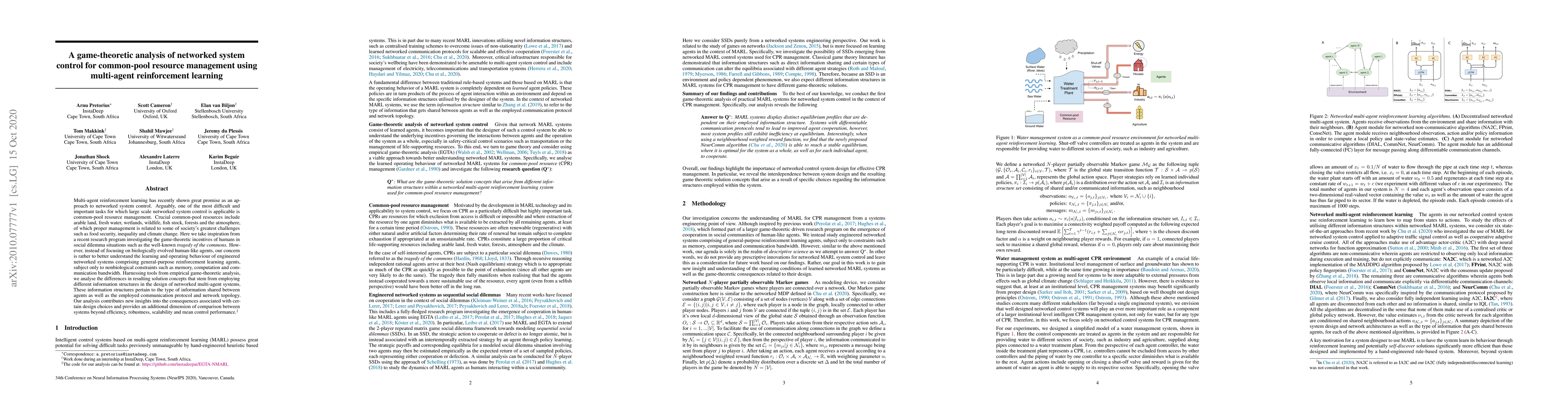 Multi-agent reinforcement learning has recently shown great promise as an approach to networked system control. Arguably, one of the most difficult and important tasks for which large scale networked system control is applicable is common-pool resource management. Crucial common-pool resources include arable land, fresh water, wetlands, wildlife, fish stock, forests and the atmosphere, of which proper management is related to some of society's greatest challenges such as food security, inequality and climate change. Here we take inspiration from a recent research program investigating the game-theoretic incentives of humans in social dilemma situations such as the well-known tragedy of the commons. However, instead of focusing on biologically evolved human-like agents, our concern is rather to better understand the learning and operating behaviour of engineered networked systems comprising general-purpose reinforcement learning agents, subject only to nonbiological constraints such as memory, computation and communication bandwidth. Harnessing tools from empirical game-theoretic analysis, we analyse the differences in resulting solution concepts that stem from employing different information structures in the design of networked multi-agent systems. These information structures pertain to the type of information shared between agents as well as the employed communication protocol and network topology. Our analysis contributes new insights into the consequences associated with certain design choices and provides an additional dimension of comparison between systems beyond efficiency, robustness, scalability and mean control performance.