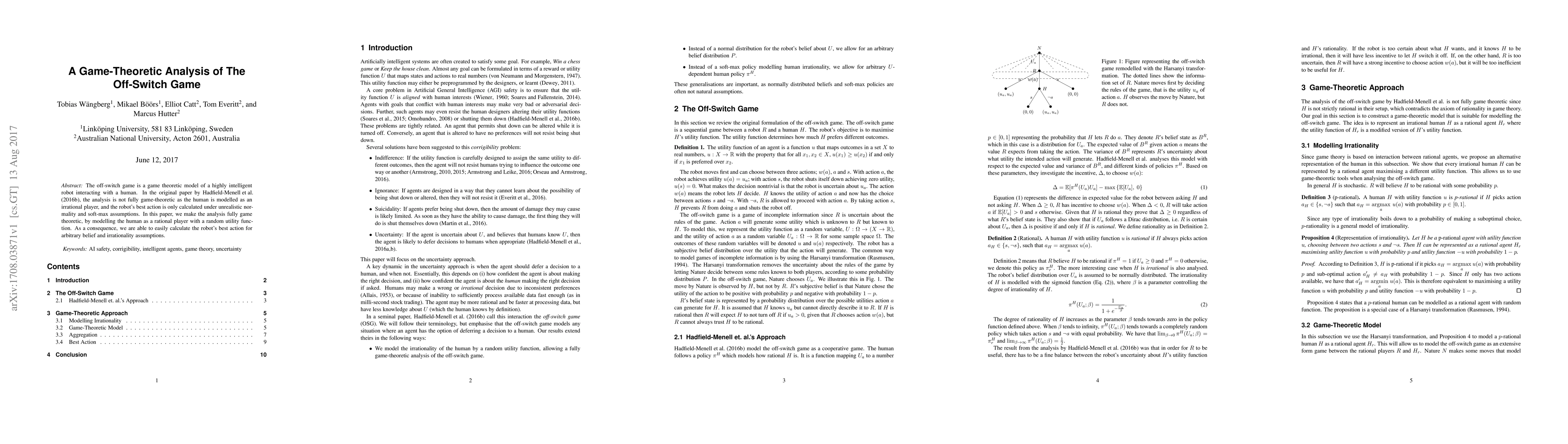 This paper refines the off-switch game model by fully incorporating game theory, treating the human as a rational player with a random utility function, thereby enabling precise calculation of the robot's optimal actions under various belief and irrationality scenarios.