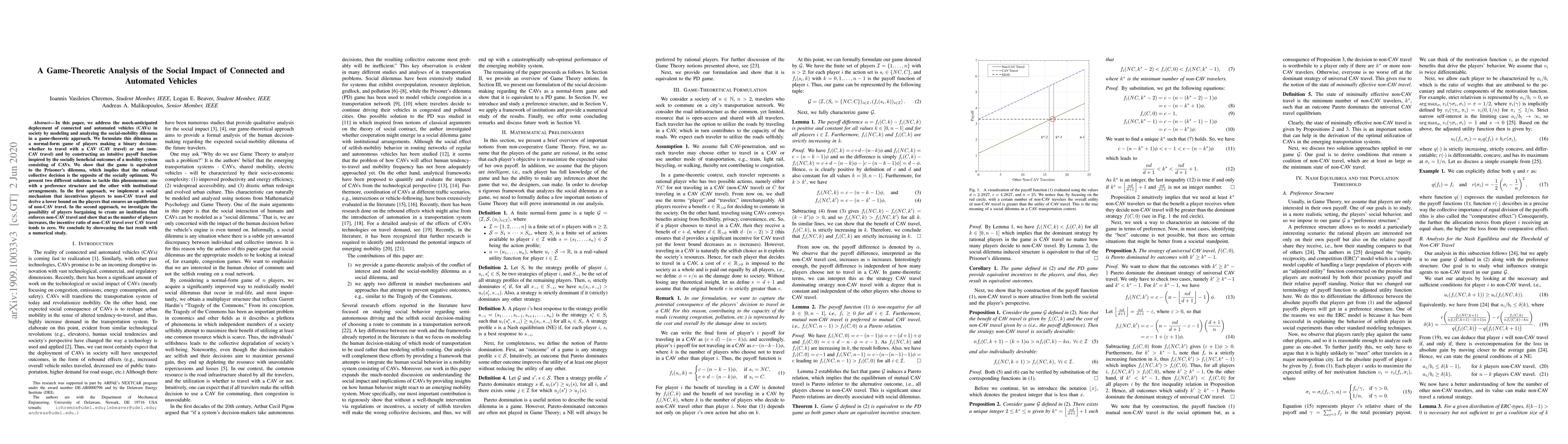This paper uses game theory to analyze the social impact of connected and automated vehicles (CAVs), modeling the social-mobility dilemma as a binary decision game. It finds that rational decisions lead to suboptimal social outcomes akin to the Prisoner's dilemma and proposes solutions including incentive structures and institutional arrangements to encourage non-CAV travel.
