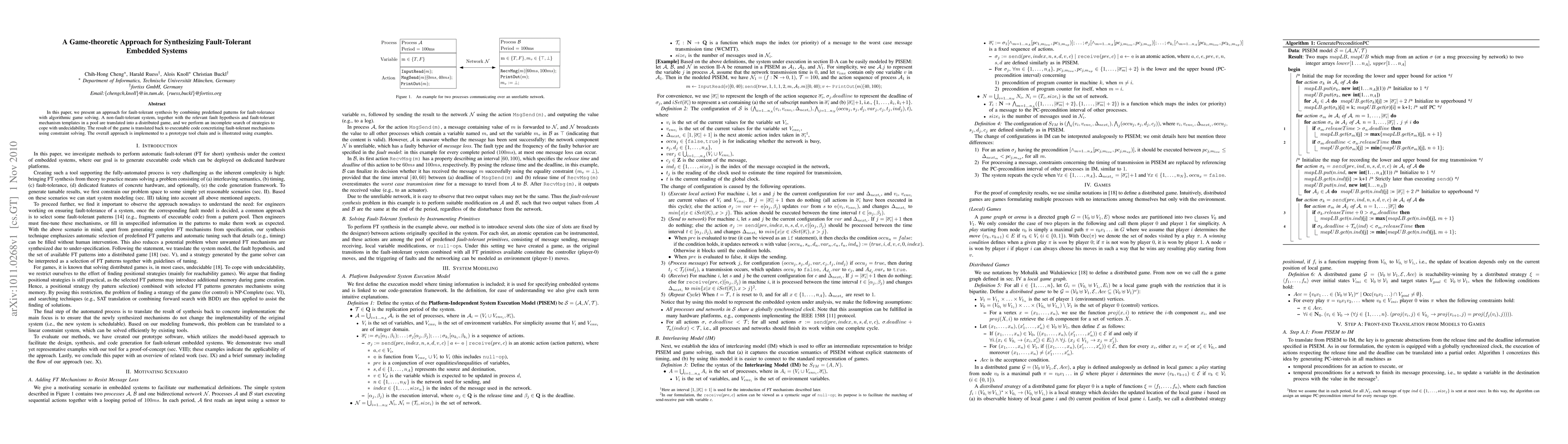This paper proposes a game-theoretic method for synthesizing fault-tolerant embedded systems by combining predefined fault-tolerance patterns with algorithmic game solving, addressing undecidability through incomplete strategy search and constraint solving. The approach is demonstrated via a prototype tool and illustrated with examples.