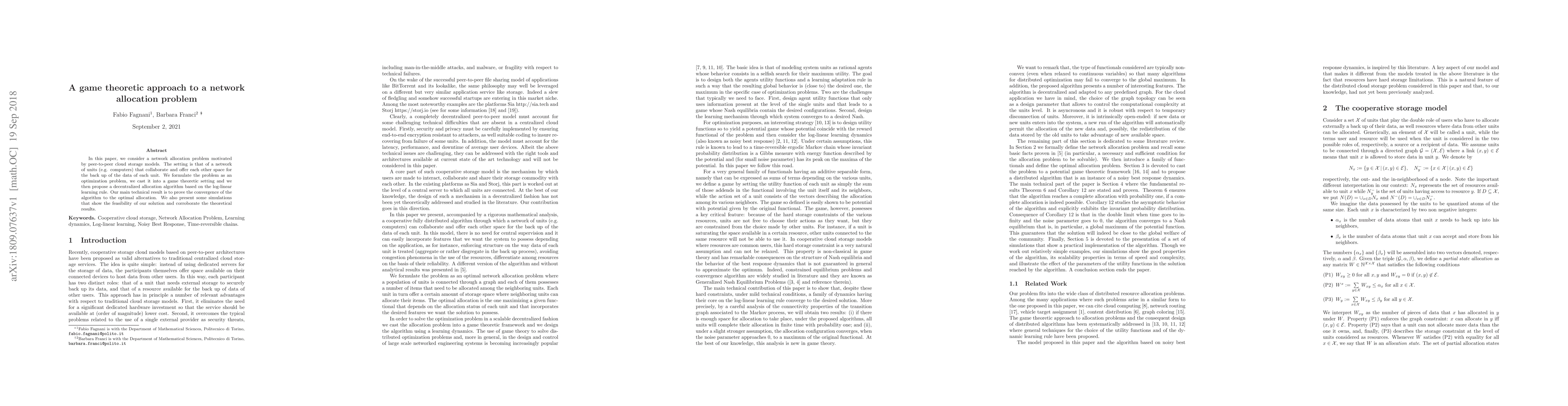 This paper formulates a network allocation problem in peer-to-peer cloud storage as an optimization problem, casts it into a game theoretic framework, and proposes a decentralized allocation algorithm based on the log-linear learning rule. The authors prove the algorithm's convergence to the optimal allocation and validate the solution through simulations.