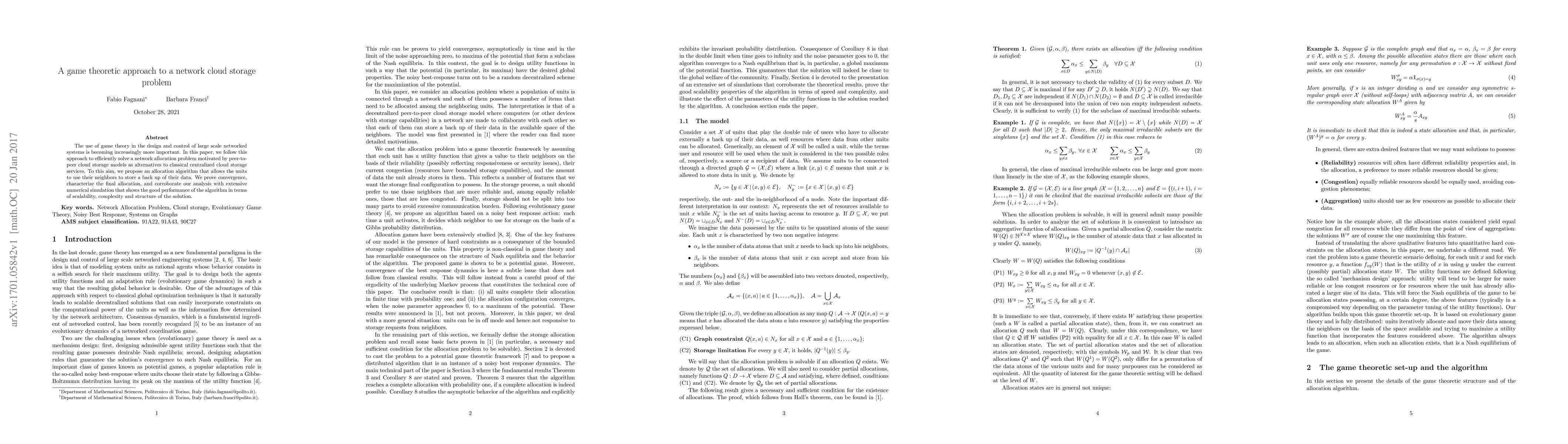 This paper proposes a game theoretic algorithm to solve network allocation problems in peer-to-peer cloud storage, leveraging neighbors for data backup. The algorithm demonstrates convergence, scalability, and efficient complexity through numerical simulations.