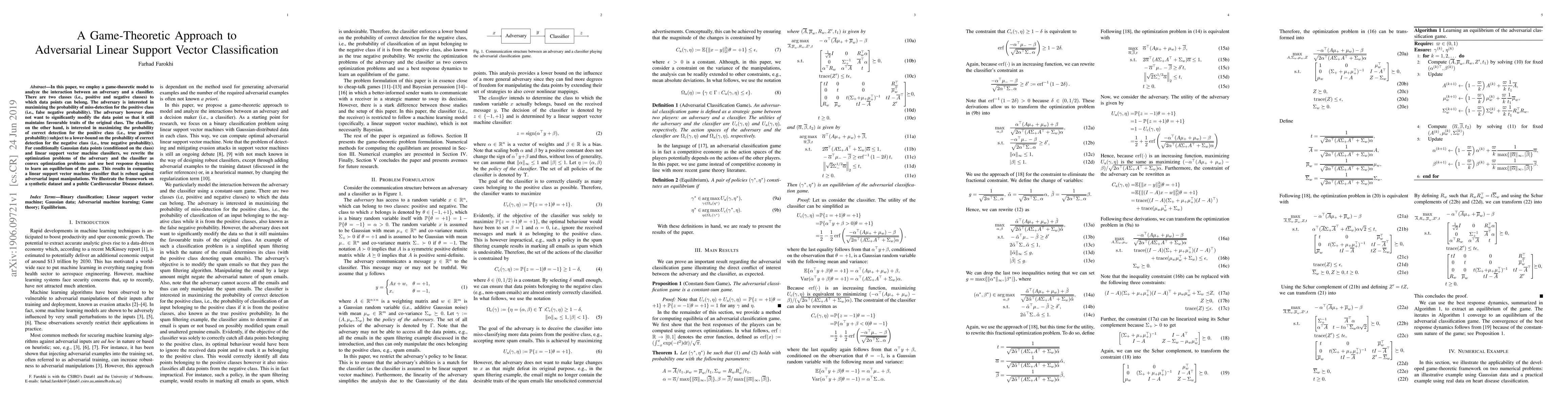 This paper uses a game-theoretic model to analyze the interaction between an adversary and a classifier in a linear support vector classification setting. The game results in a robust classifier that minimizes adversarial manipulations while maintaining accuracy for both positive and negative classes.