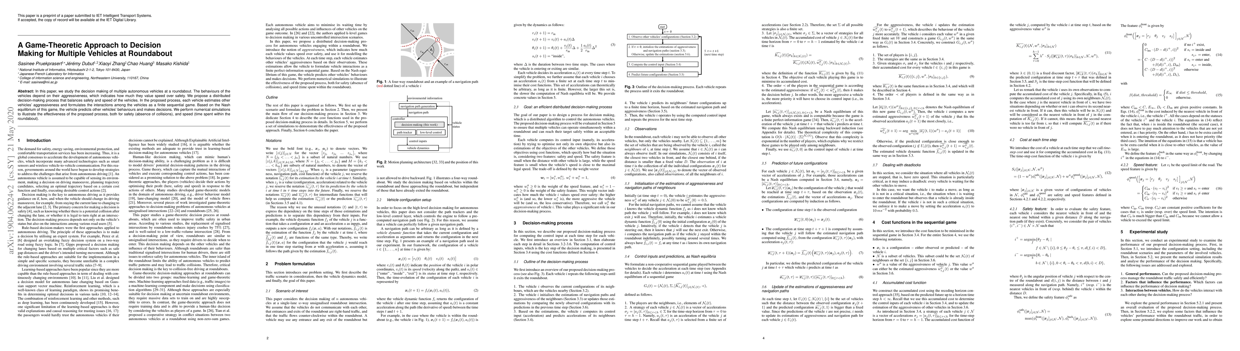 In this paper, we study the decision making of multiple autonomous vehicles at a roundabout. The behaviours of the vehicles depend on their aggressiveness, which indicates how much they value speed over safety. We propose a distributed decision-making process that balances safety and speed of the vehicles. In the proposed process, each vehicle estimates other vehicles' aggressiveness and formulates the interactions among the vehicles as a finite sequential game. Based on the Nash equilibrium of this game, the vehicle predicts other vehicles' behaviours and makes decisions. We perform numerical simulations to illustrate the effectiveness of the proposed process, both for safety (absence of collisions), and speed (time spent within the roundabout).