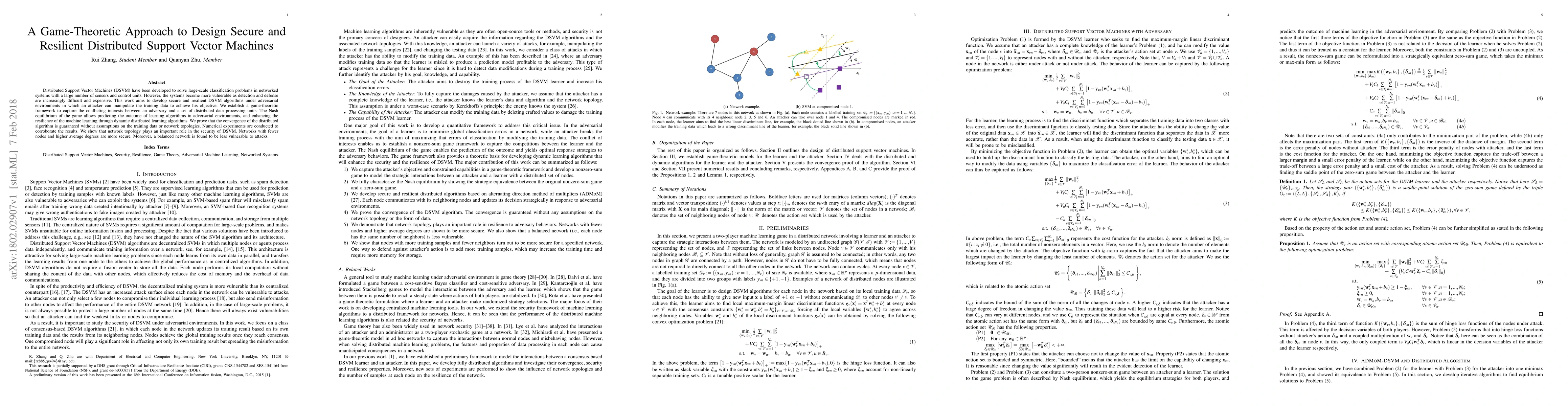 This paper proposes a game-theoretic approach to design secure and resilient Distributed Support Vector Machines (DSVM) against adversarial manipulations. It establishes a framework to predict outcomes and enhance resilience through dynamic algorithms, proving convergence without data or network assumptions, and demonstrating that network topology significantly impacts DSVM security.