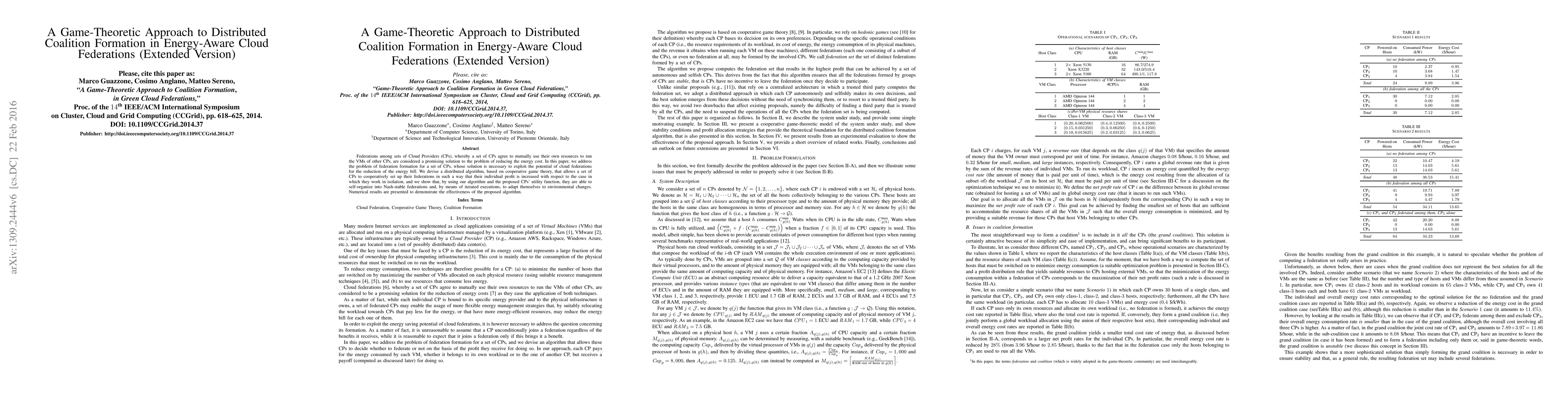 This paper proposes a distributed algorithm based on cooperative game theory for cloud providers to form energy-saving federations, ensuring individual profit increase and adaptability to environmental changes. Numerical results validate its effectiveness.