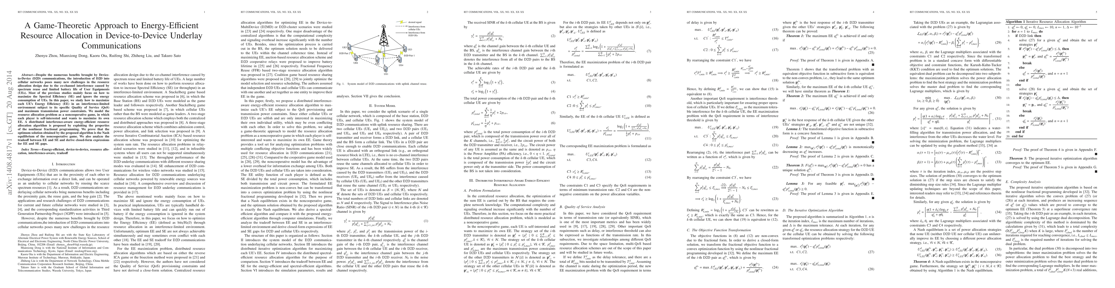 This paper proposes a game-theoretic approach to maximize Energy Efficiency (EE) in Device-to-Device (D2D) underlay communications, addressing interference and limited battery life. A distributed algorithm is developed to achieve a Nash equilibrium, balancing EE and Spectral Efficiency (SE) while considering QoS and power constraints.