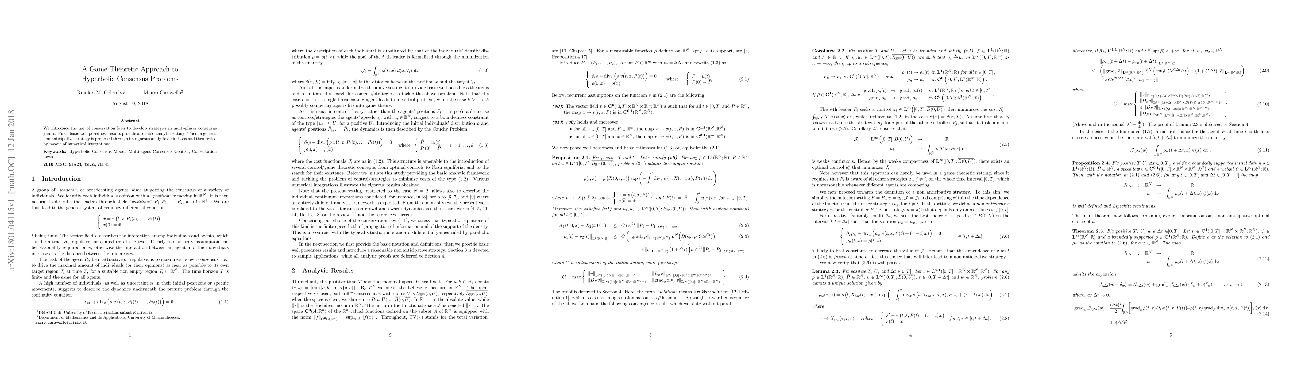 We introduce the use of conservation laws to develop strategies in multi-player consensus games. First, basic well posedness results provide a reliable analytic setting. Then, a general non anticipative strategy is proposed through its rigorous analytic definitions and then tested by means of numerical integrations.