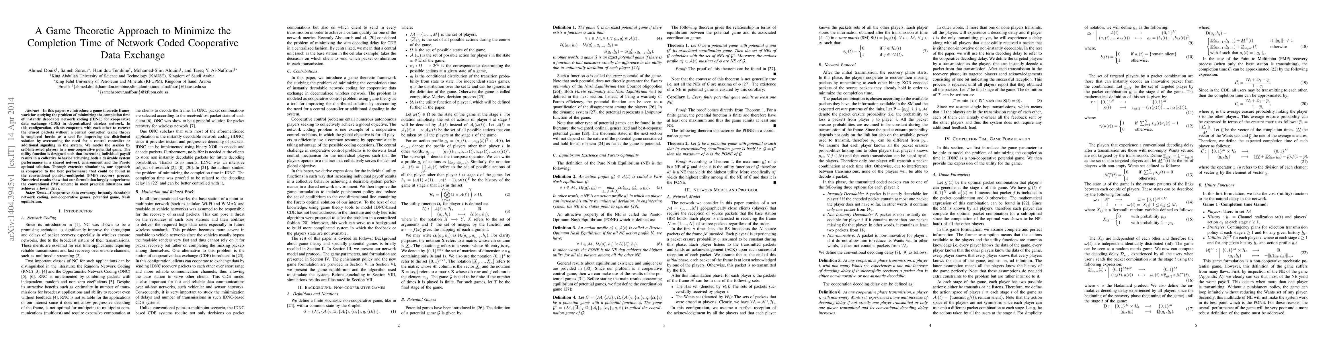 This paper proposes a game theoretic framework to minimize completion time in network coded cooperative data exchange (CDE) in decentralized wireless networks. The approach leverages a non-cooperative potential game to achieve optimal performance without a central controller, significantly outperforming conventional point-to-multipoint recovery processes in terms of delay and system performance.
