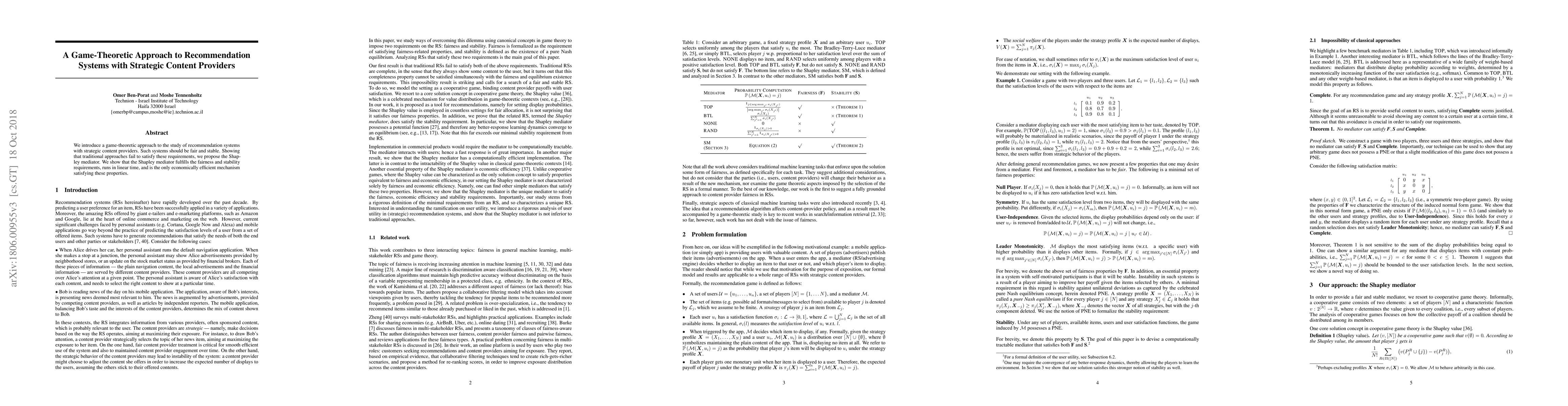This paper proposes a game-theoretic approach to recommendation systems using strategic content providers, introducing the Shapley mediator to ensure fairness and stability. The Shapley mediator is shown to be the only economically efficient mechanism that meets these requirements and operates in linear time.
