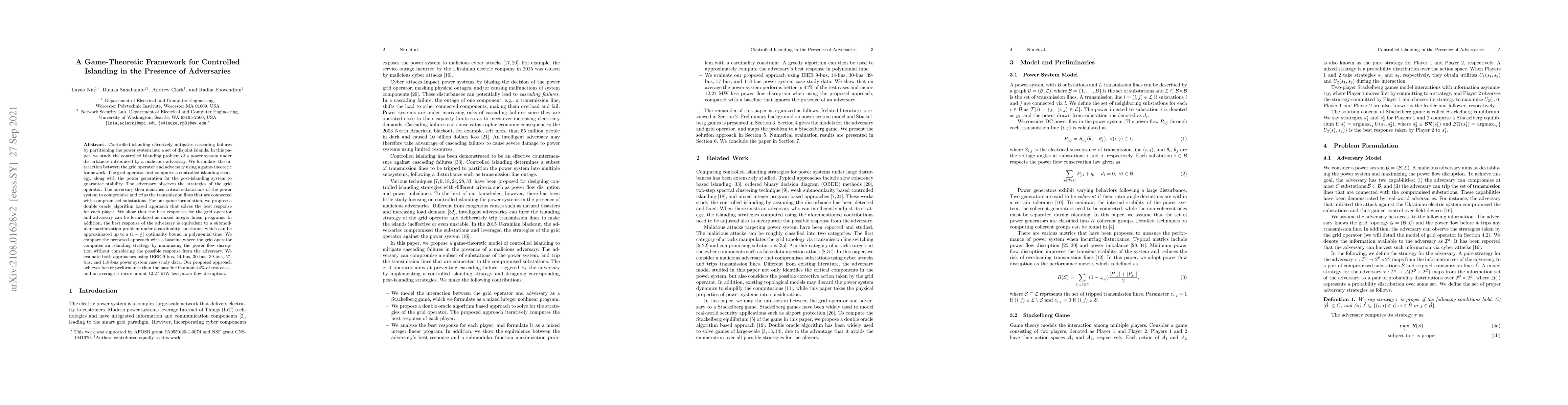 This paper proposes a game-theoretic framework for controlled islanding in power systems to mitigate cascading failures, considering adversarial attacks. The authors develop a double oracle algorithm that formulates the grid operator's islanding strategy and the adversary's attack as mixed integer linear programs, achieving better performance compared to a baseline approach.