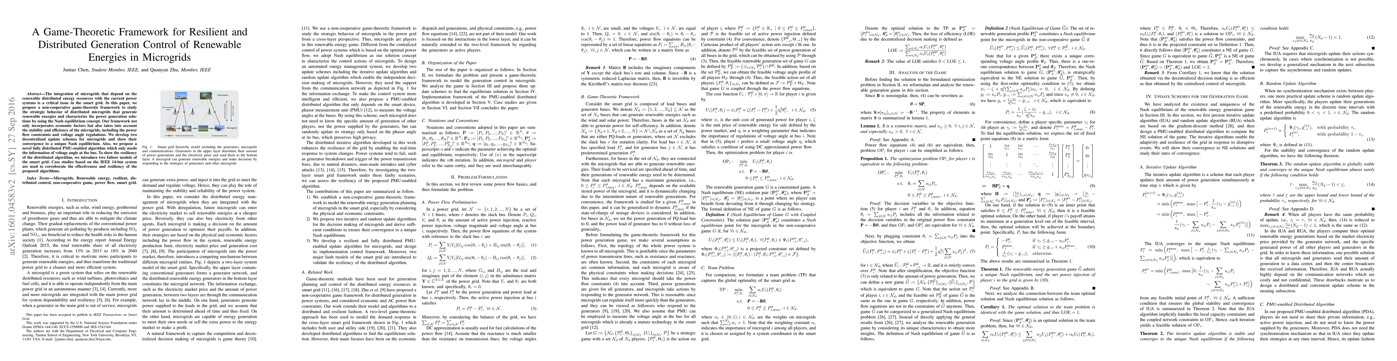 This paper proposes a game-theoretic framework to manage the strategic behavior of distributed microgrids generating renewable energy, focusing on economic, stability, and efficiency factors. It introduces two decentralized update schemes converging to a Nash equilibrium and a novel distributed algorithm requiring only voltage angle information for resiliency against smart grid failures.