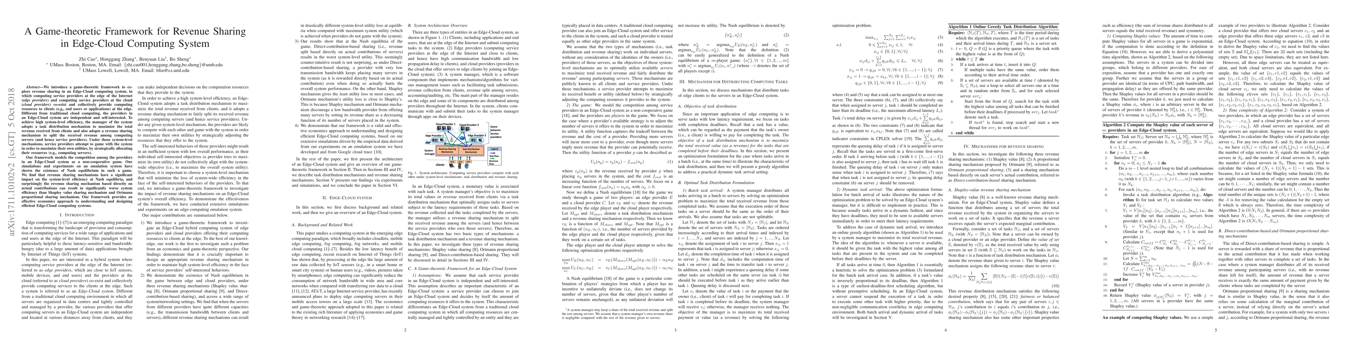 This paper introduces a game-theoretic framework to analyze revenue sharing in Edge-Cloud computing systems, where edge and cloud providers compete to maximize their utilities. The study reveals that while Nash equilibrium exists, revenue sharing mechanisms based on actual contributions can lead to worse system efficiency compared to Shapley value and proportional sharing methods.