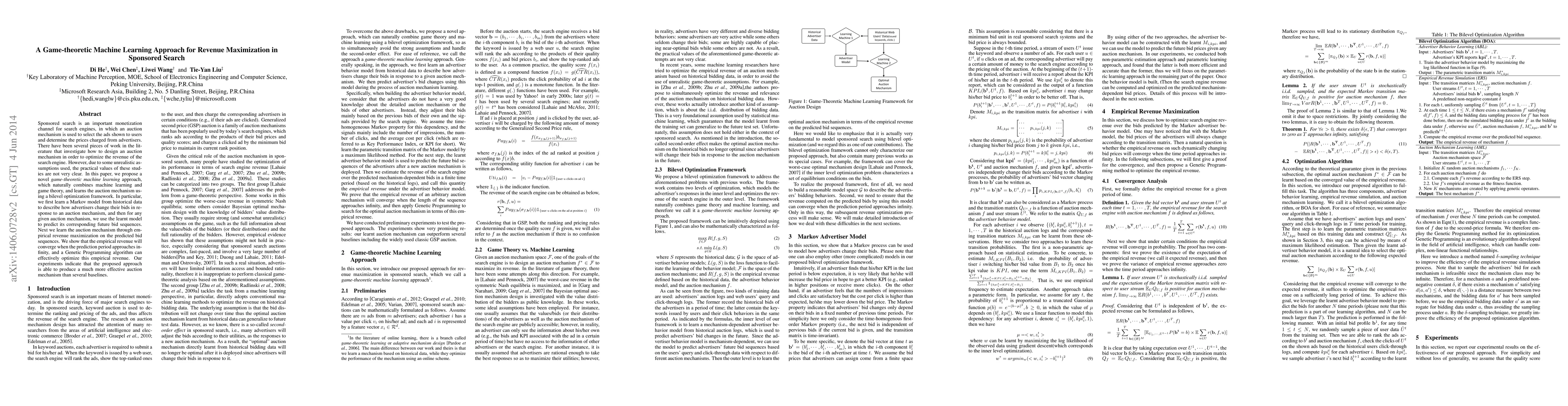 This paper proposes a game-theoretic machine learning approach to optimize the auction mechanism in sponsored search for revenue maximization. It combines machine learning and game theory to learn an auction mechanism through bilevel optimization, showing improved performance over baselines.