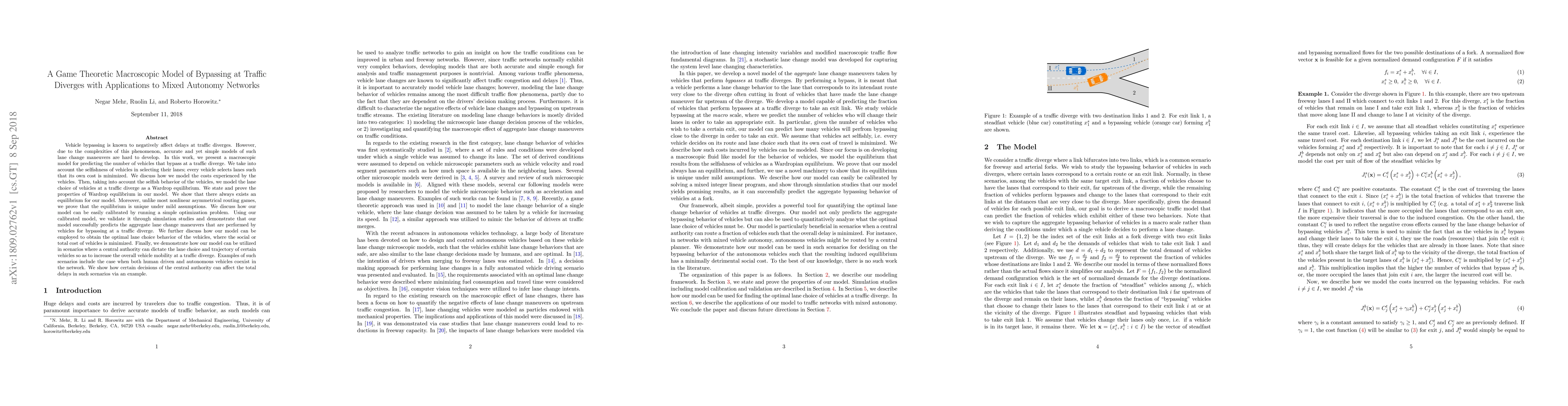 Vehicle bypassing is known to negatively affect delays at traffic diverges. However, due to the complexities of this phenomenon, accurate and yet simple models of such lane change maneuvers are hard to develop. In this work, we present a macroscopic model for predicting the number of vehicles that bypass at a traffic diverge. We take into account the selfishness of vehicles in selecting their lanes; every vehicle selects lanes such that its own cost is minimized. We discuss how we model the costs experienced by the vehicles. Then, taking into account the selfish behavior of the vehicles, we model the lane choice of vehicles at a traffic diverge as a Wardrop equilibrium. We state and prove the properties of Wardrop equilibrium in our model. We show that there always exists an equilibrium for our model. Moreover, unlike most nonlinear asymmetrical routing games, we prove that the equilibrium is unique under mild assumptions. We discuss how our model can be easily calibrated by running a simple optimization problem. Using our calibrated model, we validate it through simulation studies and demonstrate that our model successfully predicts the aggregate lane change maneuvers that are performed by vehicles for bypassing at a traffic diverge. We further discuss how our model can be employed to obtain the optimal lane choice behavior of the vehicles, where the social or total cost of vehicles is minimized. Finally, we demonstrate how our model can be utilized in scenarios where a central authority can dictate the lane choice and trajectory of certain vehicles so as to increase the overall vehicle mobility at a traffic diverge. Examples of such scenarios include the case when both human driven and autonomous vehicles coexist in the network. We show how certain decisions of the central authority can affect the total delays in such scenarios via an example.