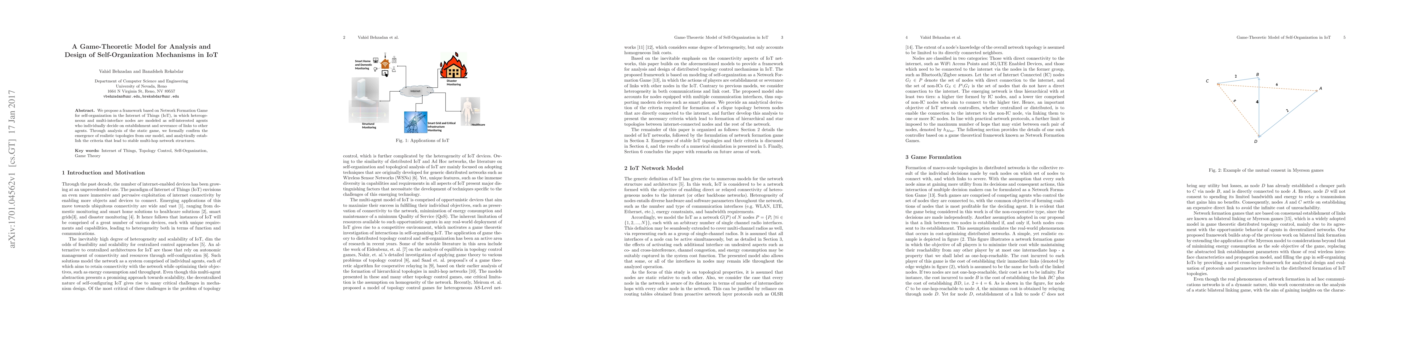 The paper introduces a game-theoretic model using Network Formation Game for IoT self-organization, where diverse nodes act as self-interested agents deciding link establishment and termination. Analysis of the static game confirms the emergence of practical network topologies and sets criteria for stable multi-hop structures.