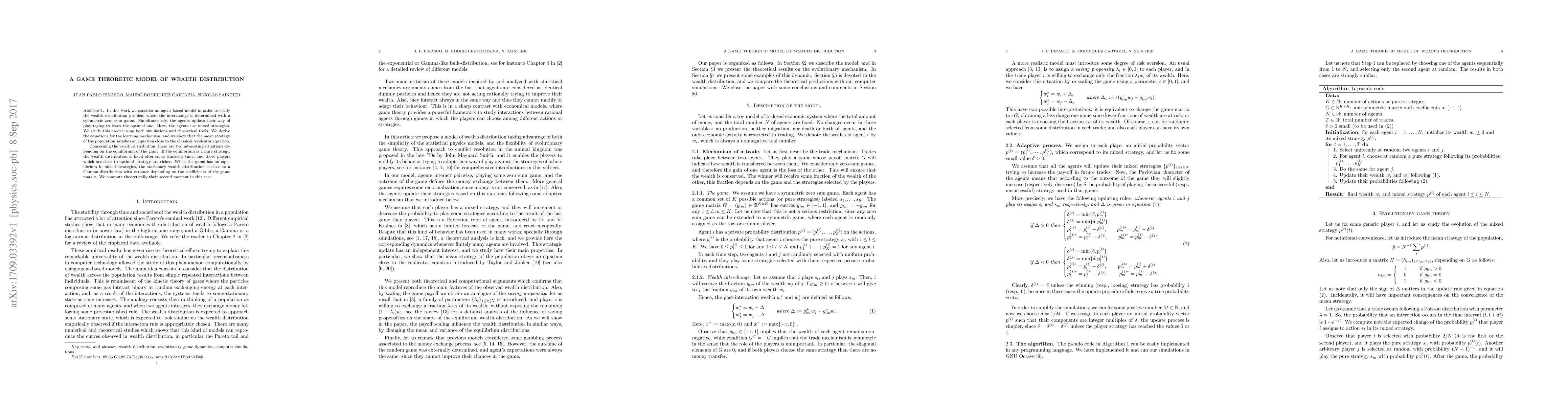 This paper proposes an agent-based model to study wealth distribution through a symmetric zero-sum game where agents use mixed strategies to learn optimal behavior. The model reveals that wealth distribution stabilizes based on the game's equilibrium, either resulting in a fixed distribution when pure strategies prevail or a Gamma distribution with variance dependent on game parameters when mixed strategies are used.