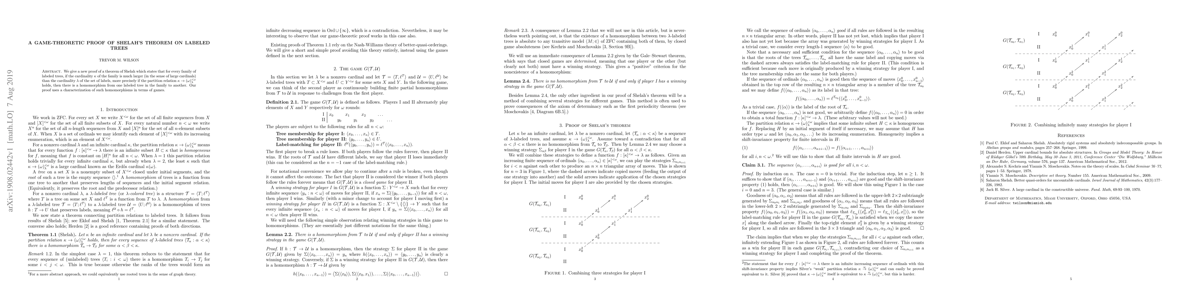 We give a new proof of a theorem of Shelah which states that for every family of labeled trees, if the cardinality $\kappa$ of the family is much larger (in the sense of large cardinals) than the cardinality $\lambda$ of the set of labels, more precisely if the partition relation $\kappa \to (\omega)^{\mathord{<}\omega}_\lambda$ holds, then there is a homomorphism from one labeled tree in the family to another. Our proof uses a characterization of such homomorphisms in terms of games.