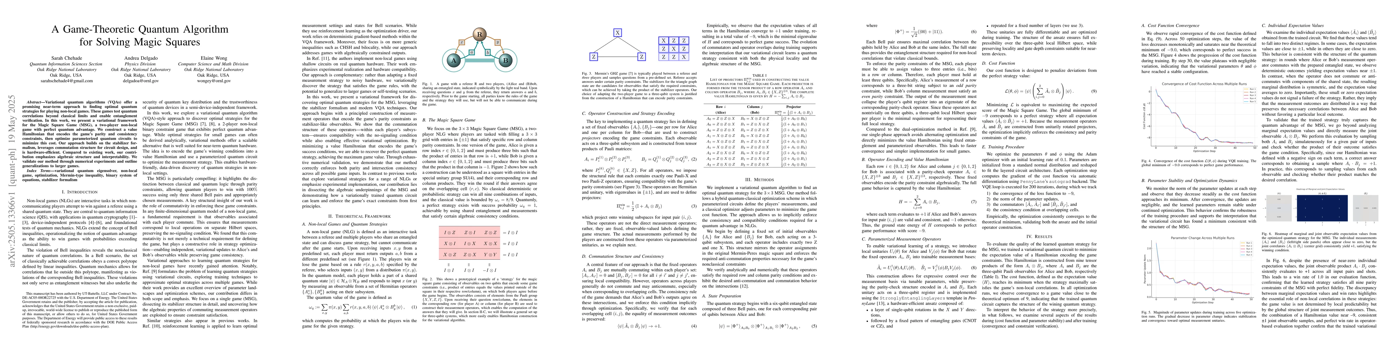 The research presents a variational framework for the Magic Square Game (MSG) using variational quantum algorithms (VQAs). It constructs a value Hamiltonian encoding game constraints and optimizes parameterized quantum circuits to minimize the cost, building on the stabilizer formalism and leveraging commutation structure for circuit design.