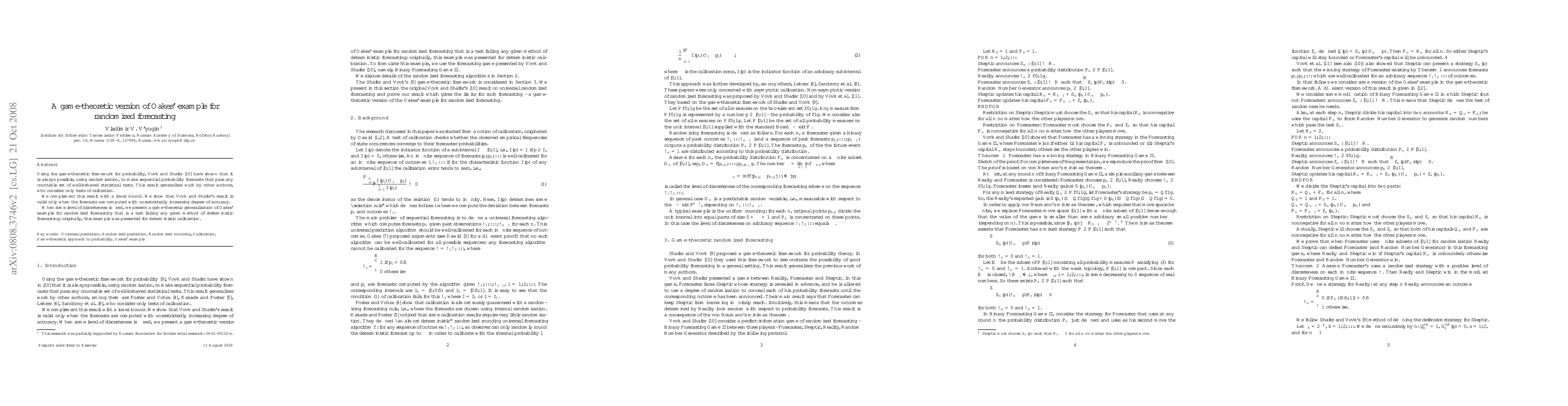 This paper presents a game-theoretic version of Oakes' example to demonstrate the limitations of deterministic forecasting methods when compared to randomized forecasting. It shows that while randomization can pass statistical tests, it only works with increasing accuracy, and deterministic methods can fail when a fixed level of discreteness is imposed.