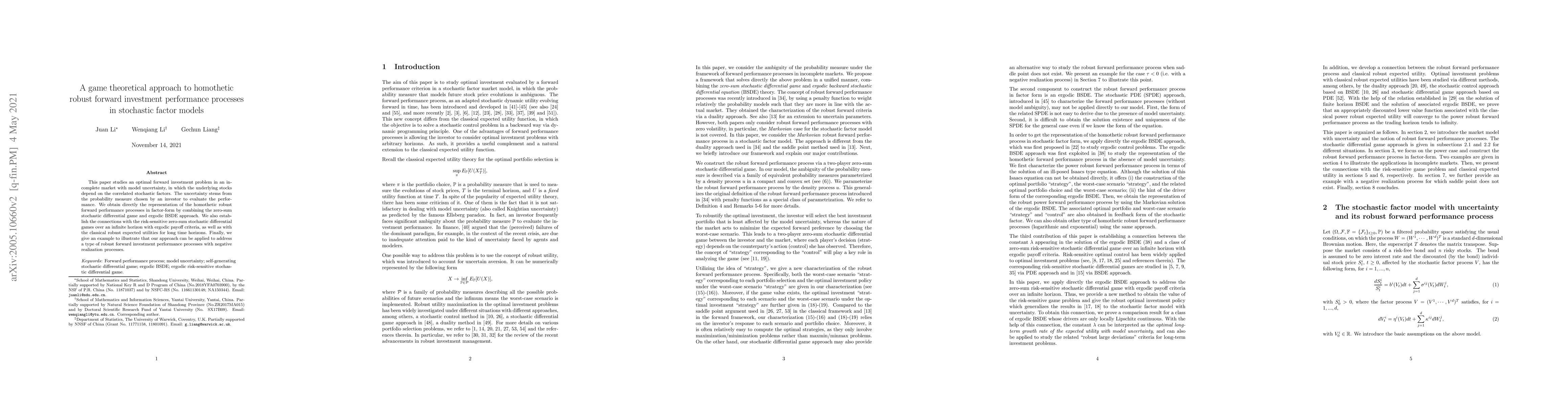 This paper develops a game theoretical framework to solve optimal forward investment problems under model uncertainty in stochastic factor models, deriving a representation of homothetic robust performance processes. It connects these processes with risk-sensitive games and classical robust utilities, and provides an example to demonstrate its applicability to negative realization processes.